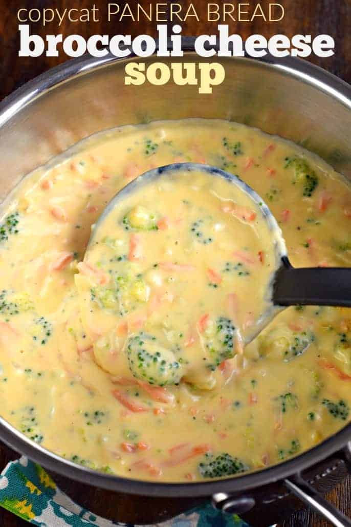 Copycat Panera Broccoli Cheese Soup is ready in less than 30 minutes! The perfect bowl of comfort food without leaving your house!Be sure to sign up for my …new recipes in your inboxMy family doesn’t love traditional fast food. Which I suppose is a good thing, except when I’m looking to just pick up a quick, on the go meal I’m limited by their taste buds!Fortunately (or not) for us, our Panera Bread has a drive through, and it’s one of the “fast food” choices we all love. Except it’s pricey. They don’t have a dollar menu!My goal with my blog has been to create a database of recipes that my family loves. They scroll through often and say “hey, can you make for dinner?” Or , “I’m craving some for dessert.”I’ve also been adding to our collection of copycat recipes. Things like Starbucks Lemon Loaf, Panera Mac and Cheese, and Hostess Cupcakes. Our Panera list has grown to include Orange Scones, Cobblestone Muffins and my favorite, Strawberry Pecan Salad. With today’s Broccoli Cheese Soup and our existing Mac and Cheese recipe, we may never have to go there again.From start to finish, this Copycat Panera Broccoli Cheese Soup takes less than 30 minutes. It’s the perfect weeknight dinner idea when you are staring at your pantry unsure what to make! This makes 3-4 decent sized bowls of soup…but you can easily double the recipe if you have hungry eaters, and this is your main dish.What take out food do YOU wish I had a recipe for? Maybe I can work on it…..I created a fun little group on facebook and I’d love for you to join in! It’s a place where you can share YOUR favorite recipes, ask questions, and see what’s new with Shugary Sweets (so that you never miss a new recipe)! If you’d like to check it out, you can request to join .Be sure to follow me on Instagram and tag #shugarysweets so I can see all the wonderful SHUGARY SWEETS recipes YOU make!Connect with Shugary Sweets! Be sure to follow me on my social media, so you never miss a post! | Bloglovin’Sign up to receive an email in your inbox for each new recipe:Copycat Panera Broccoli Cheese SoupYield:serves 3-4Prep Time:10 minutesCook Time:15-20 minutesTotal Time:30 minutesCopycat Panera Broccoli Cheese Soup is ready in less than 30 minutes! The perfect bowl of comfort food without leaving your house!Ingredients:1/4 cup unsalted butter1/2 cup diced onions (yellow or white)1 cup shredded carrots (I used matchsticks that I cut into half inch pieces)2 1/2-3 cups broccoli florets, chopped small1 1/2 cups chicken broth1 cup milk (I use skim/fat free)1 cup heavy whipping cream1/4 cup all-purpose flour1 1/2 tsp kosher salt1/2 tsp black pepperpinch of crushed red pepper flakes (or more as desired)2 cups shredded cheddar cheeseDirections:In a large pot over medium high heat, melt butter. Add in onions, carrots and broccoli. Cook to soften about 5 minutes (may be more or less depending on the size vegetables you cut).Slowly add in broth, milk, and cream. Sprinkle with flour and add salt, pepper and red pepper flakes. Continue stirring and heating over medium heat until thickened. This will take about 10-15 minutes.Once thick, add cheese and stir until melted and smooth. Serve soup and enjoy!MAKING THIS RECIPE? Share it with me on Instagram using the hashtag #ShugarySweets so I can see what you’re cooking up in the kitchen!**There may be affiliate links in this post! By clicking on them, or purchasing recommended items I may receive a small compensation. However, I only recommend products I love! Thank you for supporting Shugary Sweets! See my disclosure policy for more info**posted inSoups and StewsStay Connectedsubscribe to receive new posts via email:Blogger Work Life BalancePraline Topped Apple Bread
