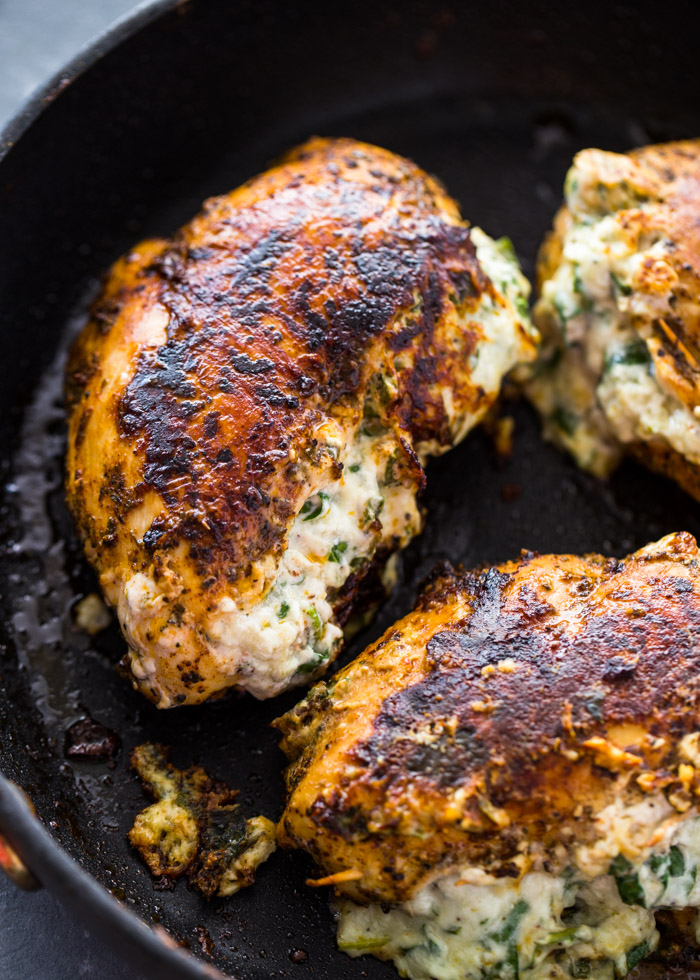 Chicken breasts stuffed with a creamy spinach, parmesan, mozzarella, and cream cheese filling and pan seared to perfection. The result is tender cooked chicken filled with a gooey trio of cheese that will melt in your mouth. Ever since I attempted the keto diet, I’ve been on the lookout for no carb recipes that are filling and packed full of protein. Although I’m not strictly following the keto diet because carbs always seem to find a way onto my plate, I feel so much better eating low-carb. I’ve lost a couple of pounds over the last few weeks so that’s a huge plus for me. If you are on a low-carb or keto diet, trying to lose weight, or just want a healthy protein packed dinner, you’re going to love this cream cheese and spinach stuffed chicken. The chicken is not breaded and cooked in just a little bit of olive oil. This cooking method gives the chicken a nice and crispy crust without adding anything extra.The filling is a mixture of cream cheese (use low-fat if needed), parmesan, mozzarella, and spinach. You can use fresh or frozen spinach but I recommend fresh spinach that has bee thinly sliced. This is a great way to get a few servings of spinach because the spinach melts right into the filling and is hardly noticeable. Watch how to make the recipe here: 4.91 from 41 votesCream Cheese Spinach Stuffed Chicken (Low-carb, Keto) Chicken breasts stuffed with a creamy spinach, parmesan, mozzarella, and cream cheese filling and pan seared to perfection. The result is tender cooked chicken filled with a gooey trio of cheese that will melt in your mouth. MY LATEST RECIPES Prep Time 15 minutes 4 4 oz chicken breasts 1 teaspoon chili powder 1 teaspoon Italian seasoning 1/2 teaspoon black pepper 1/2 teaspoon salt For the filling: 2 cups fresh spinach chopped or 10-ounce package frozen chopped spinach, thawed and squeezed dry 4 oz cream cheese at room temp 1/4 cup of Parmesan cheese 1/4 cup mozzarella cheese 1 tbsp minced garlic 1/4 tsp pepper salt to taste To Make filling:In a medium bowl, combine spinach, cream cheese, parmesan cheese, mozzarella cheese, garlic, and salt + pepper until fully combined. To Butterfly your chicken breasts: lay them flat on a sturdy surface. Place one hand on top to hold it in place and then slice 3/4 of the way through the chicken breast (be careful not to slice all the way through). To Stuff the Chicken: Season the outside of the chicken with chili powder, Italian seasoning, salt, and pepper. Spoon 1/4 of cheese mixture into the middle of the cut chicken breasts and fold the chicken so the cream cheese is sealed inside. Use toothpicks to secure chicken if desired. To Cook: Heat a non-stick skillet on medium high and add 1 tablespoon olive oil. Cook the chicken, covering the pan with a lid, for about 9-10 minutes per side or until the chicken is cooked through. Nutrition Facts Cream Cheese Spinach Stuffed Chicken (Low-carb, Keto) Amount Per Serving (1 chicken breast) Calories 121 Calories from Fat 99 Iron 2.1% * Percent Daily Values are based on a 2000 calorie diet. I agree to have my personal information transfered to Mad Mimi ( more information )