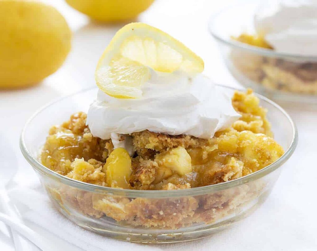 Lemon Cream Cheese Dump Cake is a dessert that is as easy to make as it is delicious! Lemon pie filling is covered with white chocolate, cream cheese, and lemon cake mix, topped with butter for a perfectly baked summertime treat! Try my for another easy to make dessert. Lemon Cream Cheese Dump Cake I have always said that the genius who decided to dump a bunch of dessert staples into a pan and see what happens next deserves an award. That person is my hero. Dump cakes are a dream recipe for busy people. This Lemon Cream Cheese Dump Cake is no exception. With the added white chocolate and cream cheese in the mix, it is a wonderful addition to my list of dump cake recipes! Lemon Cream Cheese Dump Cake Recipe In just about five minutes, you can get all these ingredients ‘dumped’ into a pan and walk away as it bakes, which makes this a wonderful weeknight, or anytime, dessert! Ingredients (full recipe below) How to Make Lemon Cream Cheese Dump Cake You hear me talking a lot about “your recipe is only as good as your ingredients” and most cases, that is my primary rule of thumb. This dessert is designed for ease. So, in this case, you won’t hear me say that. For this Lemon Cream Cheese Dump Cake recipe, you need just your favorite brands of the five listed ingredients. To make the dump cake, grease a 12-inch, oven-safe skillet. You can also use a 9×9-inch baking pan or 9×13-inch pan. Top with some ! Can You Make a Crockpot Dump Cake? You can and you should! It is literally the exact same recipe and instructions, except you use a crockpot instead of the skillet and an oven. For this method, you will put the lemon pie filling in the bottom of a greased crockpot, add the white chocolate chips and cream cheese, and then top with the cake and butter. Cover and cook on high for 2 hours. Looking for More Lemon Desserts? 1 hr 5 mins Lemon pie filling is covered with white chocolate, cream cheese, and lemon cake mix, topped with butter for a perfectly baked summertime treat! Keyword: Lemon Cream Cheese Dump Cake Preheat oven to 350°F.In a 12-inch skillet (or greased 9×9 or 9×13-inch baking dish), add the lemon pie filling. Sprinkle the white chocolate chips over the pie filling.Add the cubed cream cheese, spreading them out evenly.Sprinkle the cake mix over the top, being careful to cover all of the pie filling.Slice the butter into small pads (about 16) and spread them out evenly over the top of the cake mixture. Bake for 1 hour or until the topping is golden brown and the pie filling is bubbling.