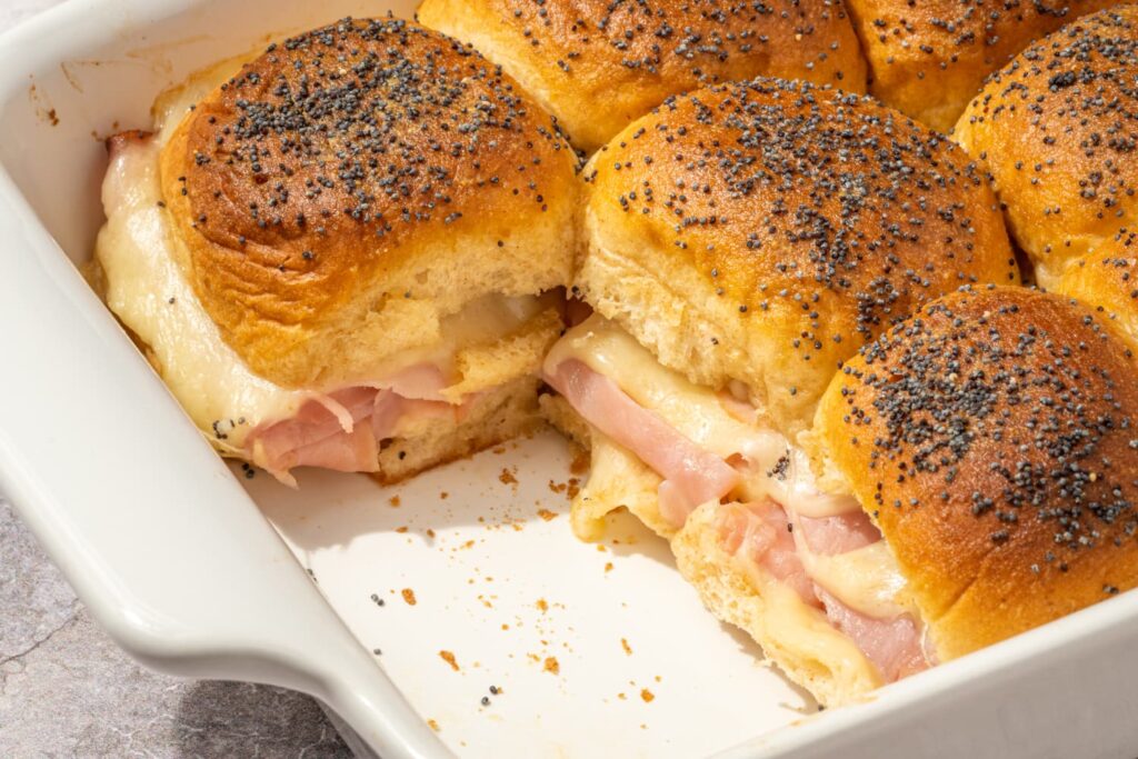 These sliders have it all: sweet slices of ham, irresistibly gooey Swiss cheese, squishy Hawaiian rolls, and a savory butter drizzled over top.