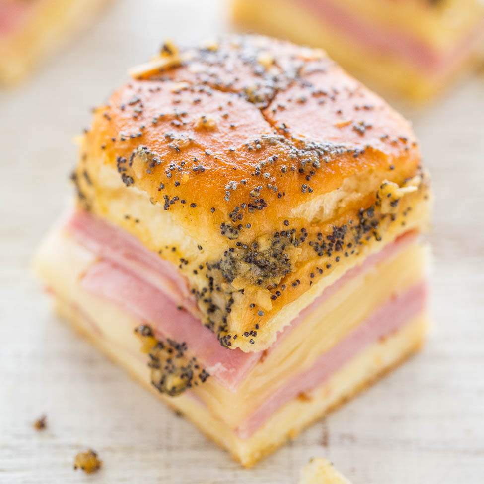 Ham and Cheese Sliders – Baked juicy ham and Swiss nestled in soft Hawaiian rolls and brushed with a buttery Dijon, onion, and poppy seed topping!! Fast, EASY, and a party FAVORITE!! Fast, Easy, Perfect For Parties and Snacks If you’re in need of an easy comfort-food recipe for tailgating, holiday parties or events, or an after-school snack that everyone loves, this will do the trick. Baked juicy ham and Swiss cheese nestled in soft, sweet Hawaiian rolls with a buttery Dijon, onion, and poppy seed topping. Hawaiian Bread For The Win Hawaiian bread is one of my all-time favorite kinds of bread and it’s absolutely perfect for the sliders. It stays soft and tender in the interior and while the base of the sliders have an ever-so-slight crispiness from the buttery mixture that drips down during baking. Where Does All The Flavor Come From There’s flavor galore from the juicy ham, savory cheese, sharp Dijon mustard, poppy seeds, dried onions, and Worcesteshire sauce. While eating the sliders the term ‘butter fingers’ may come to mind. Soft, white, warm bread covered in butter is never a bad thing. As a bonus your cuticles will be extra moisturized. Ham and Cheese Sliders Yield: 12 sliders Total Time: about 30 minutes Prep Time: 5 minutes Cook Time: about 25 minutes If you’re in need of an easy comfort-food recipe for tailgating, holiday parties or events, or an after-school snack that everyone loves, this will do the trick. Baked juicy ham and Swiss cheese nestled in soft, sweet Hawaiian rolls with a buttery Dijon, onion, and poppy seed topping. The bread stays soft and tender in the interior and while the base of the sliders have an ever-so-slight crispiness from the buttery mixture that drips down during baking. There’s flavor galore from the juicy ham, savory cheese, sharp Dijon mustard, poppy seeds, dried onions, and Worcesteshire sauce. one 12-count package Hawaiian sweet rolls, sliced in half (see directions for more details) 3/4 pound cooked deli ham, thinly sliced 3/4 pound Swiss cheese, thinly sliced 1/2 cup (1 stick) unsalted butter, melted 1 tablespoon dijon mustard 1 tablespoon poppy seeds 2 teaspoons dried minced onion 2 teaspoons Worcesteshire sauce 1/4 teaspoon salt, or to taste 1/4 teaspoon pepper, or to taste Directions: Preheat oven to 350F. Line a 9×9-inch or 9×13-inch pan with aluminum foil, spray with cooking spray; set aside. Using a large serrated knife, slice the rolls in half so you have a ‘slab’ of tops and a ‘slab’ of bottoms; don’t pull the rolls apart and slice individually because you want to keep them connected. Place the bottom ‘slab’ of rolls in prepared pan. Evenly layer about half of the ham over the rolls. Evenly layer the cheese. Evenly layer the remaining ham. Add the top ‘slab’ of rolls; set aside. To a medium microwave-safe bowl, add the butter and heat on high power to melt, about 1 minute. Add the mustard, poppy seeds, onion, Worcestershire sauce, salt, pepper, and whisk to combine. Evenly and slowly pour the butter mixture over the rolls. Use a spatula to spread the mixture over the tops. Some of the mixture will pool at the base of the rolls. Cover with aluminum foil and allow rolls to stand at room temp for about 5 to 10 minutes. Bake covered for about 20 minutes or until cheese has melted. Uncover and cook for about 3 to 5 minutes, or until as done as desired. Baking time will vary based on the size of pan used, climate and oven variances, etc. Bake until as done as desired; watch to make sure they don’t burn since all ovens and ingredients vary. Slice into individual sliders and serve immediately. Sliders are best warm and fresh. Recipe from Averie Cooks. All images and content are copyright protected. Please do not use my images without prior permission. If you want to republish this recipe, please re-write the recipe in your own words, or simply link back to this post for the recipe. Thank you. Related Recipes Pepperoni Pizza Sliders – Pizza by way of supremely cheesy sliders!! EASY, ready in 15 minutes, and perfect for parties because everyone LOVES them! Totally IRRESISTIBLE!! Beer and Bourbon Barbecue Chicken Sliders – Chicken is cooked with beer and bourbon before being soaked in bbq sauce! So juicy, flavorful, easy, and ready in 25 minutes! Caramelized Onion and Portobello Mushroom Sliders with Fry Sauce – Meatless comfort food at its finest! Hearty, satisfying and so good! Easy Cheese Bomb Bread –  Soft, buttery bread brushed with garlic butter and stuffed with CHEESE! So good, mindlessly easy, goofproof, and ready in 10 minutes! A hit with everyone! Pepperoni Pizza Bombs – Pizza by way of soft, warm rolls stuffed with pepperoni and oodles of CHEESE!! Easy, ready in 15 minutes, perfect for PARTIES, and simply IRRESISTIBLE!! Easy Cheddar Sourdough Bread – No starter required and so easy! It tastes like it’s from a fancy bakery! Who can resist homemade cheesy bread! No-Knead Make-Ahead Dinner Rolls with Honey Butter – The easiest dinner rolls ever! No kneading, no fuss and you can make the dough ahead of time! Perfect for holiday meals and parties! One-Hour Soft Buttery Breadsticks – Fast, easy, from-scratch breadsticks that are the perfect appetizer or side to any meal! Soft Buttery One Hour Pretzels – Just like pretzels from the mall, except right at home! Fast, easy, and ready in one hour! Originally published August 2016, updated April 2019, and republished January 15, 2021.  We are a participant in the Amazon Services LLC Associates Program, an affiliate advertising program designed to provide a means for sites to earn advertising fees by advertising and linking to amazon.com.