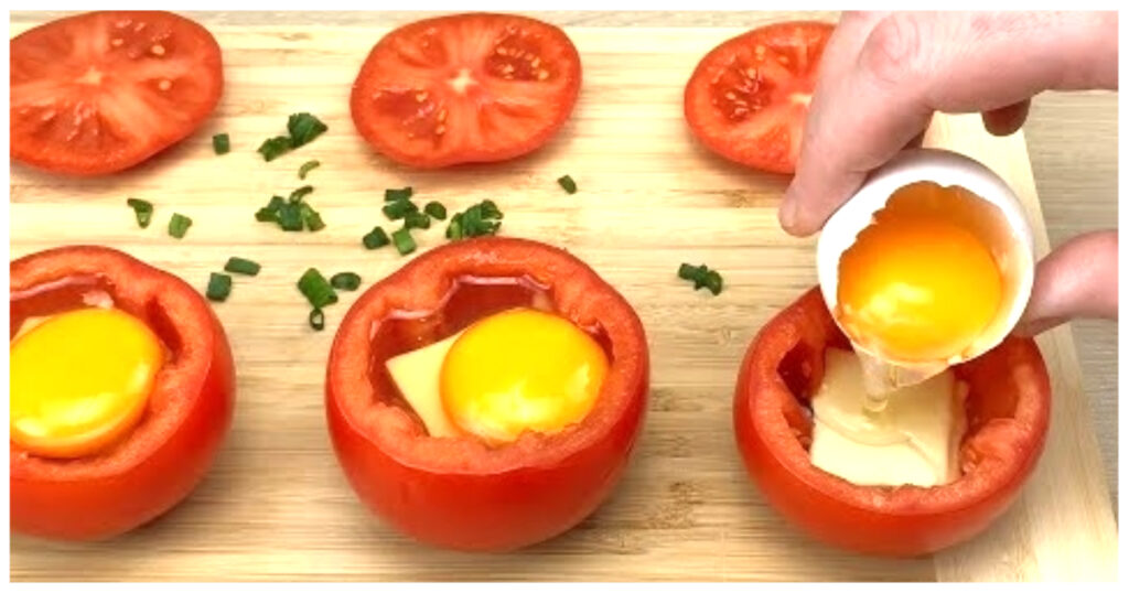 Pour egg into a tomato with a slice of cheese for a savory and delicious breakfast dish