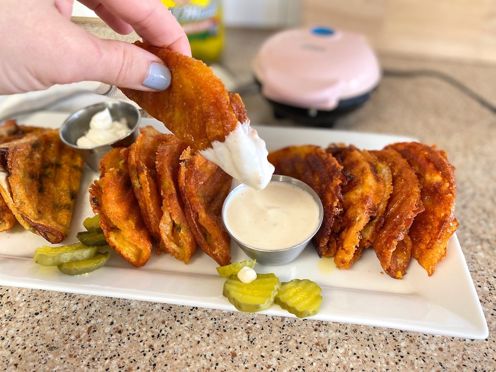 Looking for a quick and easy keto snack? Have you seen all of the viral recipes lately on social media using the Dash Mini Waffle Maker? With only a few simple ingredients you can make delicious crunchy cheese waffles in minutes. Now that’s my kind of snack! 😋 Easy peasy keto snackin’! I spotted this video from Good Eats With Rose on Tik Tok, and she cleverly combined two simple ingredients together to create the ultimate keto fried pickle cheese waffle recipe. I ran to my fridge and grabbed some pickles and shredded cheese to try out this recipe ASAP! I love simple but comforting low carb snacks and this one checks all of the boxes! You could have this for a quick keto snack, lunch, or even make a few and have an appetizer spread. I couldn’t help myself and took it a step further by making a few variations of these keto cheese waffles: the original pickles & cheese, Monterey Jack & jalapeño cheddar, and cheddar bacon. Variety is the spice of life so why not! 😋 Tips for making 2-ingredient crunchy cheese waffles in the Dash Mini Waffle Maker: yield: 1 SERVINGS total time: 4 MINUTES With just a mini waffle maker, shredded cheese, and yummy add-ins, you can make these tasty & crunchy keto snacks! Fried Pickles: Jalapeño Popper: Cheddar Bacon: Cheddar Bacon Additional Notes Fried Pickle nutrition: Amount Per Serving: Calories: 221.9, Total Carbohydrates: 2.4g, Fiber: 0g, Net Carbohydrates: 2.4g, Total Fat: 18.0g, Protein: 12.0g Monterey Jalapeño nutrition: Amount Per Serving: Calories: 221.6, Total Carbohydrates: 2.4g, Fiber: 2.2g, Net Carbohydrates: 0.2g, Total Fat: 16.0g, Protein: 12.1g Cheddar Bacon nutrition: Amount Per Serving: Calories: 290, Total Carbohydrates: 2.0g, Fiber: 0g, Net Carbohydrates: 2.0g, Total Fat: 23.0g, Protein: 20.0g This simple cheese waffle recipe is almost TOO good! The only negative thing I could think of about this simple keto recipe is the fact that it is so dang good that I couldn’t just eat one. I ended up making six of the crunchy cheese waffles and ate them all. Oops! I made a batch for my boys to enjoy when they got home from school, too. I loved being able to serve them a delicious snack that wasn’t packed with a bunch of sugar! Next time you’re looking around thinking you have nothing to throw together, you might be surprised what you can make in your Dash mini waffle maker – like these irresistible cheese crisps!