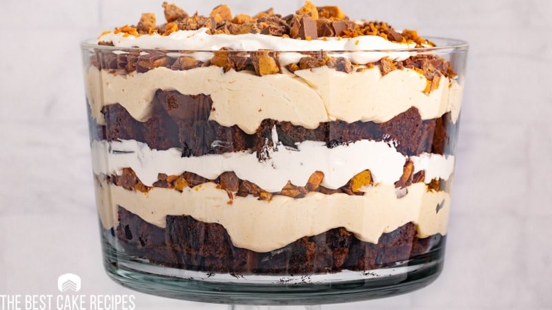 Peanut butter and chocolate lovers will go crazy over this Reese’s Butterfinger Cream Cheese Trifle. It has an chocolate cake layered with fluffy cream cheese filling and chopped up Oreos, Butterfinger and Reese’s cups! How many of you love a “wow” dessert? You know, one of those desserts that is put out at a party or get-together and is gone 15 minutes? Maybe you baked that delicious cheesecake or those amazing frosting cookies that everyone loved. Don’t you just love seeing people enjoy your baking? If you’re looking for an easy-peasy “wow” dessert that your friends and family will beg you for, you’ve come to the right place. All you need is a few ingredients, a little time, and all the self-control in the world. Trust me, for this recipe, you’ll need it. Why you’ll love this recipe: Reese’s Butterfinger Cream Cheese Trifle Inspiration Have you ever had Adam’s Peanut Butter Fudge Ripple Cheesecake at the Cheesecake Factory? Oh my goodness, it is my FAVORITE. So rich, delicious, and decadent. We don’t get there as often as I’d like to, so we decided to create a trifle version of my favorite dessert. I helped my mom put this Reese’s Butterfinger Cream Cheese Trifle together while my friend and I were making a fancy decorated cake for a party. We had leftover cake and needed to use it up. This trifle, without a doubt, is easier than a fancy layer cake any day. It took my friend and I 4 1/2 hours just to ice the cake.Talk about hard work! My mom made the trifle in only 45 minutes of that time. Both were “wow” desserts, but throwing together a trifle is 10 times easier. The Parts of a Trifle Trifles are generally made of some time of cake, pudding, whipped cream and another food item such as berries, candy or nuts. Many times they include cream cheese or a homemade custard and can have sauces or syrups. For this trifle, we layered the following: chocolate cake, cream cheese peanut butter filling, Cool Whip and candies. It’s the perfect combination of sweet and creamy with a little crunch from the candy. How to Make Reese’s Butterfinger Cream Cheese Trifle Make a cake: I made a boxed chocolate cake mix and added crushed Oreos to the batter. You can do this exact thing or you can make a homemade chocolate cake. (Or want something a little more decadent? Use brownies!) Make the filling: Layer the trifle: Cut the cake into small pieces or cubes. Put a layer of cake in the bottom of the trifle dish. Spoon 1/2 of the cream cheese filling on top of the cake. Sprinkle with 1/3 of the peanut butter cups and Butterfinger bars. Put 1/2 of the reserved Cool Whip on top of the candy. Repeat the layers: cake, cream cheese filling, candy and Cool Whip. Then top with the remaining 1/3 of the candy pieces. What if your trifle dish is too small? If you have leftover parts of the trifle, make individual servings to freeze for later when that sweet craving hits! Reese’s Butterfinger Cream Cheese Trifle Peanut butter and chocolate lovers will go crazy over this Reese’s Butterfinger Cream Cheese Trifle. It has an chocolate cake layered with fluffy cream cheese filling and chopped up Oreos, Butterfinger and Reese’s cups! 1 box Pillsbury chocolate cake mix 15.25 ounces, plus ingredients shown on the back of the box to prepare the cake1 package Oreo cookies 15.5 ounces, quartered8 fun-size Butterfinger candy bars chopped1 bag miniature Reese’s peanut butter cups 12 ounces, choppedFilling:Prepare the chocolate cake mix according to the box directions. Set aside. Quarter the Oreos** and add the cookie pieces to the cake batter. Pour the batter into a greased 9×13 pan. Bake as directed on the back of the box. The cake will most likely need an additional 10 minutes for baking, but check it often. When a toothpick inserted in the middle comes out clean, the cake is done. Set the cake on a wire rack to cool. Cool the cake completely before putting the trifle together. I made my cake earlier in the day so it would be ready to go when I needed it.For the filling:In the bowl of a stand mixer, add the softened cream cheese, butter and peanut butter. Whip these ingredients together until they are well combined, about 1 minute. Add the powdered sugar and beat for an additional 1-2 minutes. Carefully fold in 8 ounces of the Cool Whip. (You’ll use the remaining Cool Whip for layering in the trifle.)Now you’re ready to assemble the trifle. Cut the cake into small pieces or cubes. Put a layer of cake in the bottom of the trifle dish. Spoon 1/2 of the cream cheese filling on top of the cake. Sprinkle with 1/3 of the peanut butter cups and Butterfinger bars. Put 1/2 of the reserved Cool Whip on top of the candy. Repeat the layers: cake, cream cheese filling, candy and Cool Whip. Then top with the remaining 1/3 of the candy pieces.Depending on the size of your trifle dish, you may not be able to fit all of the ingredients in. We used all of our filling, but had about 1/4 of the cake leftover. As you prepare the trifle, be sure to leave enough room so that you can have two of each layer and it will look so pretty!Refrigerate until serving. This can be made a day in advance.If your chocolate cake is already made up, feel free to add the Oreos into the trifle along with the chopped candies. The calories shown are based on the trifle serving 20, with 1 serving being 1/20 of the trifle. Since different brands of ingredients have different nutritional information, the calories shown are just an estimate. **We are not dietitians and recommend you seek a nutritionist for exact nutritional information. The information in the nutrition box are calculated through a program and there is room for error. If you need an accurate count, I recommend running the ingredients through your favorite nutrition calculator.** Calories: 546kcal | Carbohydrates: 76g | Protein: 7g | Fat: 26g | Saturated Fat: 12g | Polyunsaturated Fat: 4g | Monounsaturated Fat: 8g | Trans Fat: 1g | Cholesterol: 25mg | Sodium: