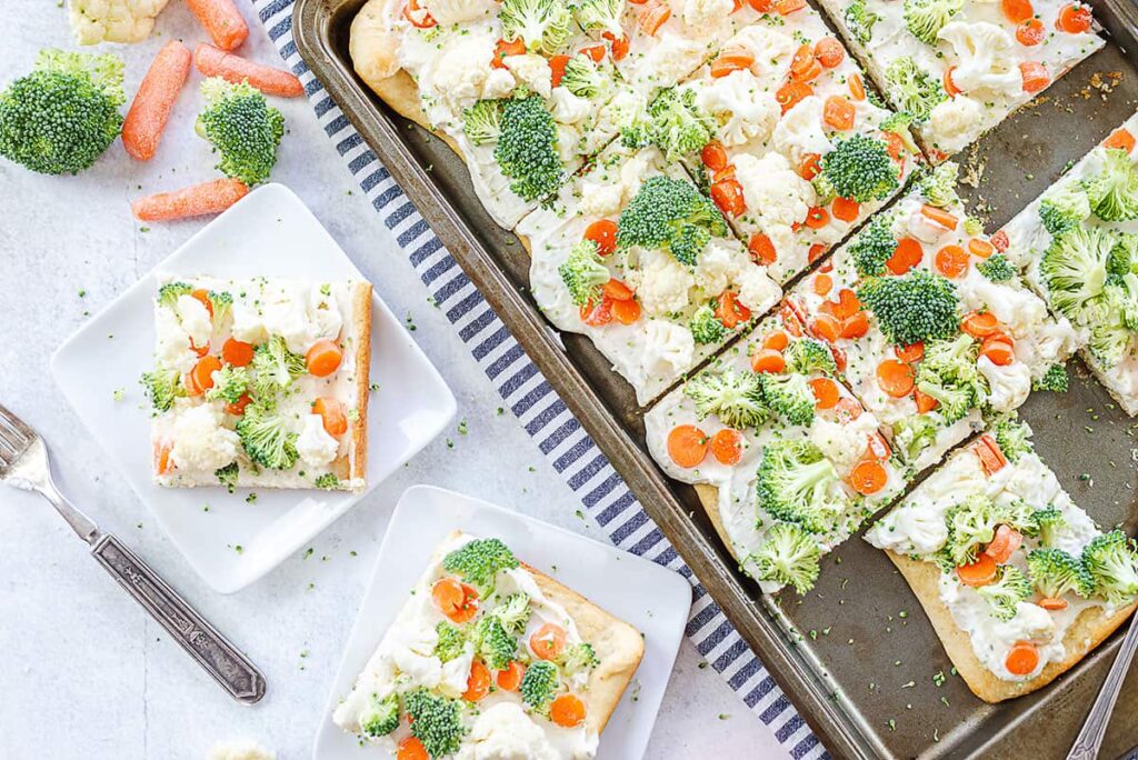 Okay, I’m aware that this recipe has been floating all over the dang internet for years now, but the thing is…I had never tried it. I looked at it and thought..vegetables on pizza? Seems rude. I’ll pass! Then I showed up for a get together at my mother-in-law’s house and she had a huge platter of little veggie pizza squares. I eyed them suspiciously. “What’s that creamy white stuff on top?” I asked her. “Oh, just cream cheese and ranch powder,” was her answer. Y’all. I hoovered that entire platter of veggie pizza in my face so fast she is probably still traumatized. Cream Cheese Veggie Pizza…who knew it was actually delicious and seriously irresistible?? Ingredient for Veggie Pizza Recipe: Crescent Dough – We use crescent dough sheets. They’re just one big sheet of dough without the perforations. If you can’t find those, regular crescent roll dough will work fine too. Sauce – We’re combining softened cream cheese and mayo with ranch dip powder. It’s so creamy, loaded with flavor, and makes the perfect ‘sauce’ for this cream cheese veggie pizza. Veggies – We use a mixture of carrots, broccoli, and cauliflower. Extras – We’ve heard from many readers that they add sliced black olives, red onions, and peppers to their pizza and also top it all with a layer of shredded cheddar. Personally, I think it’s perfect as I shared it, but feel free to add the extra cheese or any other veggies you might like. What We Love About This Recipe! This cold veggie pizza is super easy to prepare when using crescent dough sheets for the crust. It bakes up in no times and then it’s just a quick and easy mix of the cream cheese and ranch. And that’s what we really love most about this recipe – the ranch flavored cream cheese “pizza sauce”! How to Make Veggie Pizza: Crust: To prepare this easy pizza crust you’ll just unroll both of the crescent dough sheets onto a half sheet pan and then press the edges together so that it forms one large crust. So easy! Now just bake it in the oven for 10 minutes until it is lightly golden. Let it cool completely – this will take an hour or so. Helpful Tip! Tools you will need: Cream Cheese: Now to make the “pizza sauce.” Mix together the softened cream cheese, mayonnaise, and dry ranch mix until well combined. Spread that over the cooled crust. It’ll be a nice thick layer. Veggies: Chop up your fresh veggies and then start loading them up as toppings for this cold veggie pizza! We really like the cauliflower, broccoli, and carrot mix but feel free to put your own spin on this one. Slice: All that’s left to do now is to slice the veggie pizza into squares and serve them up! They’re perfect as an appetizer or snack and they’re sure to go quickly at any gathering or party. FAQs: How to store veggie pizza? This cold veggie pizza recipe is best store in the refrigerator well covered for up to a day. Let it come to room temperature before serving for the best taste. This cold veggie pizza recipe is best store in the refrigerator well covered for up to a day. Let it come to room temperature before serving for the best taste. Is veggie pizza healthy? As much as I’d love to call this one health food, it does start with a can of processed dough and gets topped with cream cheese, mayonnaise, and packaged ranch seasoning. It’s probably not the healthiest choice, but it makes a great treat that still packs in some nutritious vegetables. As much as I’d love to call this one health food, it does start with a can of processed dough and gets topped with cream cheese, mayonnaise, and packaged ranch seasoning. It’s probably not the healthiest choice, but it makes a great treat that still packs in some nutritious vegetables. What’s on veggie pizza? We put broccoli, cauliflower, and carrots on our veggie pizza, but peppers, onions, black olives, and cucumbers also make for a great topping. Many people top their pizza with shredded cheddar, too! We put broccoli, cauliflower, and carrots on our veggie pizza, but peppers, onions, black olives, and cucumbers also make for a great topping. Many people top their pizza with shredded cheddar, too! What Readers are Saying! “This was fun to make. made it for family and they loved it . I used an extra pack of cream cheese and mixed with shredded cheese for the bottom n with bacon bits ! Oh my lord !!!!! It’s amazing! Ty again for the recipe” – Jason Can’t wait to hear what you think of my vegetable pizza recipe! If you love appetizers and snacks you should also try out my sweet Chex mix recipe, buffalo chicken dip recipe, fried pickles, and buffalo chicken sliders. I love appetizers and dips and snacks and share them often. 🙂 Follow me on social for more recipe ideas & inspiration! This cold veggie pizza is a total classic. It makes a great snack or appetizer and is easily halved or doubled. The crescent dough base is so soft and that cream cheese topping makes this one irresistible! 5 from 6 votesPreheat oven to 375 degrees.Unroll crescent dough sheets and place on half sheet pan. Press together to seal the edges to form one large crust that covers the pan.2 packages Pillsbury Crescent Dough SheetsBake for 10 minutes or until lightly golden. Cool completely, about 1 hour.Add the cream cheese, mayonnaise, and ranch mix to a mixing bowl and stir well until combined.16 ounces cream cheese, 1/2 cup mayonnaise, 1 ounce dry ranch dip mixUse an off-set spatula to spread the mixture over the cooled crust.Chop the veggies into small pieces and sprinkle over the top of the cream cheese mixture.4 cups assorted chopped vegetablesCut into small squares and serve.Tips & Notes:Crust – We like the dough sheets because they are just one uniform sheet of dough, but if you can’t find those, the crescent rolls will work just as well. Roll the dough out and press together the perforations to make one large sheet of dough. Ranch Dip – If you’re sensitive to sodium, use the ranch 