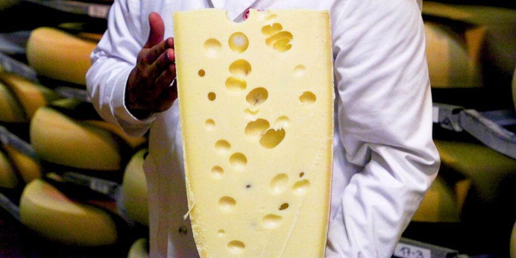 Cheese production started in the area east of Bern over 200 years ago. It’s a hilly region, so good for cattle grazing.  17,700 tons of Emmentaler are produced each year in this region by 150 family dairies, with 16 distributors. Emmentaler is made in various regions in Switzerland: Aargau, Bern, Glarus, Lucerne, Schwyz, Solothurn, St. Gallen, Thurgau, Zug, and Zurich. It was granted AOP protection from the EU in 2002, meaning that these areas are the “protected designation of origin.” But there are a few qualifications for this. The milk has to be from dairy farms no fewer than 20 kilometers away. And it must be produced using raw milk. The Emmentaler Schaukäserei show dairy opened in 1989.The world-famous holes? They’re created by a reaction in the bacteria. After one month of storage, a strain of bacteria, Propionibacterium shermanii, consumes lactic acid and releases carbon dioxide. These bubbles become trapped in the cheese rind and form holes (also known as eyes).The size of Emmentaler wheels is heavily regulated, as most have a diameter of 80 to 100 centimeters. They need to be a minimum 75 kilograms and maximum 120 kilograms. For cheese produced here, a kilogram costs 19 Swiss francs, or $19, so one wheel could cost over $1,900.  The cheese is matured to a four-month classic, eight-month “Reserve,” 12-month “AOP extra,” and 24-month vintage.Ninety-five percent of cheese sold with Emmentaler label are fake Emmentaler. The brand Emmentaler Switzerland actively pursues ‘copies’ of the cheese. Each cheese can be identified by its bacteria, as well as a bespoke cheese number on the rind. Special thanks to the Geneva Tourist Board and My Switzerland.EDITOR’S NOTE: This video was originally published in September 2019.