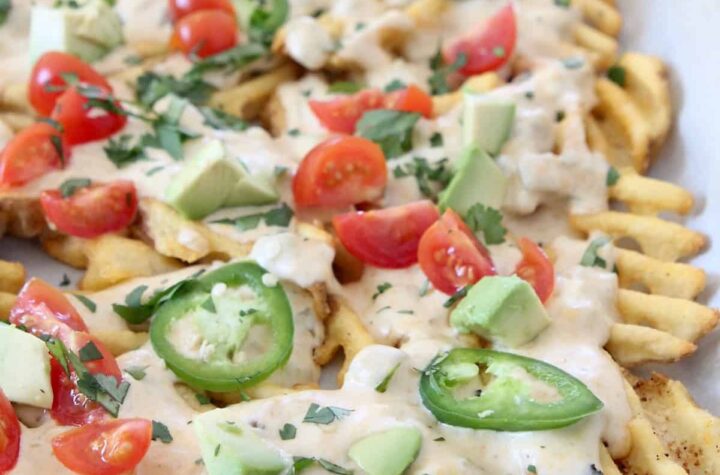 Crispy waffle fries are smothered in the most delicious, creamy Green Chili Cheese Sauce and loaded up with all your...