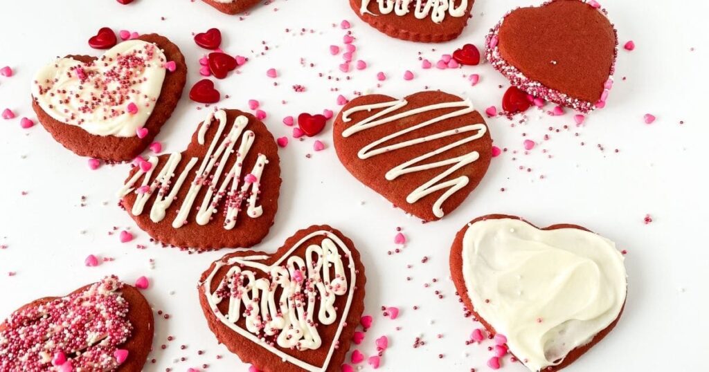 You are going to adore how easy it is to make this batch of red velvet cookies! They are a perfect cut-out cookie recipe that is loaded with chocolate flavor and easily topped with your favorite homemade cream cheese icing. Whether you cut these in random shapes or use this recipe for hearts like shown, it’s a great Valentine’s Day cookie recipe everyone loves! Red Velvet Cookies I love to roll out and cut out cookies. They are ideal for cutting into shapes for holidays, and in particular, this red velvet recipe is perfect for Valentine’s Day. I really love how pretty they are on a platter, and kids will love eating a red cookie. If you like red velvet, you’ll also like these red velvet crinkle cookies, red velvet cinnamon rolls with cream cheese icing, and top it all off with a cup of creamy red velvet hot chocolate! All are delicious, easy to make, and a great addition to your Valentine’s Day party or event. What do Red Velvet Cookies Taste Like? Red velvet is a classic chocolate flavor. Most often, it is a red food coloring that adds the bright red color, and underneath you have rich chocolate. This cookie is a light chocolate flavor that is simple, delicious, and perfectly accented by the cream cheese icing on top. Tips for Decorating Red Velvet Cookies I love these cookies because they are perfect for decorating. That means I can use my favorite cream cheese icing below and some fun sprinkles. I love sprinkles on cookies, and this is a perfect recipe. If you want to add sprinkles to the cookies, you can do that both before or after baking. This is totally up to you. If no icing will be on the cookies, I recommend adding the sprinkles before baking or just when they come out of the oven. Fresh from the oven the cookies are soft enough that the sprinkles will stick and stay in place. If not then, you will need icing to hold them in place. When decorating these cookies, I recommend letting them cool completely before handling them to add icing. You can ice by spreading with a small spatula, or you can use a piping bag and tip to create a design. I love the idea of adding a ring of icing around the outside and then spreading just enough on the inside of that heart to sprinkle on some of your favorite sprinkles. Can You Freeze Red Velvet Cookies? Yes! One of my favorite things about this cookie dough is how easy it is to make ahead of time. When making cookies to freeze, there are two methods that work best. Below you will find my tips for making cut out cookies and freezing for later. What are Red Velvet Cookies Made Of? Ingredients for Cream Cheese Icing How to Make Red Velvet Cookies Preheat the oven to 375°F and line baking sheets with parchment paper or silicone baking mats. Sift or whisk together flour, cornstarch, salt, and cocoa powder and set aside. In a large bowl, cream together the butter, sugar, and cream cheese until smooth. To the butter mixture, add the egg yolk, vanilla extract, and red food coloring, and then mix well. Scrap down the sides of the bowl then add in the prepared dry ingredients mixing until fully combined. Place the dough between two sheets of parchment paper and roll the dough to the desired thickness (1/4″-1/2″). Dust with additional flour if it feels too wet. Cut out hearts or other shapes and place the cutout cookies onto the prepared baking sheets. Bake for 12-16 minutes or until just browning along the edges. Cool for 5 minutes on the baking sheet, then transfers to continue cooling on a wire rack for an additional 25-30 minutes. How to Make Cream Cheese Icing In a large bowl, beat the cream cheese and butter together until smooth. Add in the powdered sugar a little at a time until just combined. Mix in the vanilla extract and continue beating until light and fluffy. Pipe or spread onto cookies then decorate with additional sprinkles or candy pieces. More Cookie Recipes Chef’s Tip To get the most even thickness across your dough, I recommend using an adjustable rolling pin. These are excellent because they have so many different thickness options and help you keep the entire sheet of dough even.Red Velvet Cookies with Cream Cheese Icing These red velvet cookies with an easy cream cheese icing are a perfect addition to any Valentine’s Day party! Slightly chocolate flavored and soft, they are a tasty treat kids will love. Prep Time 15 minutes Ingredients for Cookies Ingredients for Cream Cheese Icing How to Make Red Velvet CookiesHow to Make Cream Cheese IcingCookies best stored in an airtight container at room temperature if not iced. If cream cheese icing is added, they should be refrigerated. Serving Size: 1© Katie Hale