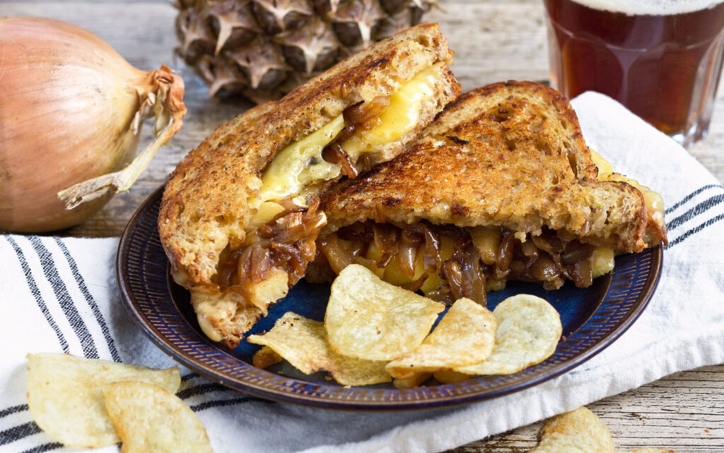 This sandwich is melty, sweet, and salty. It’s simply outta this world. Onions are caramelized and then cooked with fresh pineapple, making the pineapple tender and allowing the flavors to mix. The cheese is stretchy like it should be, and the bread is crisp and buttery from the skillet. Grilled Cheese with Caramelized Onions and Pineapple [Vegan] $2.99 Save Trees. Print Less. But if you must, we charge $2.99 to encourage less waste Cover the bottom of a frying pan in olive oil (or an olive oil/vegan butter mix) and put the burner on medium to medium-high heat. Depending on your stove and burners, you may need to reduce the heat to keep the onions from burning. Slice the onions to your desired thickness, add to the pan and stir to coat with oil. After about 10 minutes, add some salt to the onions and stir. Fry the onions for 20 more minutes. Stir occasionally, but not too much, or the onions won’t brown. If necessary, add a little water now and then. While the onions are cooking, chop the pineapple, slice the cheese, and butter one side of each piece of bread. After you’ve cooked the onions for at least 30 minutes, add the chopped pineapple to the onions and cook for 5 more minutes to warm/soften them a bit. Then remove the onions/pineapple from the pan and quickly wipe clean. Put the burner back on medium to medium-high heat, and add some butter/oil to the pan. Place bread slices buttered side down, followed by cheese, top with onion/pineapple mixture, more cheese, and finally, the second slice of bread, buttered side up. Cover the pan (so cheese melts) and cook about 3-5 minutes — you want the bread to be brown but not burn. Flip the sandwiches and repeat. Discover more recipes with these ingredients