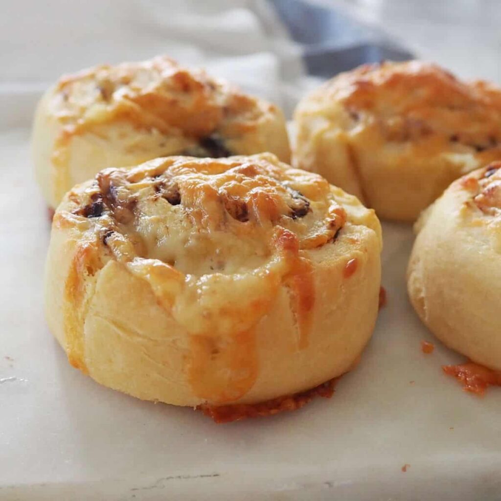These homemade Vegemite and Cheese Scrolls are just like the ones you buy at Baker’s Delight – but even better! They are yeast free, so you can have them ready to enjoy in less than an hour and both regular and Thermomix instructions are included. Thanks to this easy recipe for homemade Vegemite and Cheese Scrolls, you will no longer need to visit Baker’s Delight to buy their Cheesymite Rolls! This recipe requires just a few ingredients to put together, and as these scrolls are yeast free, you will be enjoying them in no time at all. Steps for Making Homemade Vegemite and Cheese Scrolls: It really is easy to put these scrolls together: Tips for Making these Vegemite and Cheese Scrolls: How do you store these Scrolls? These Scrolls are best stored in an airtight container in your pantry for up to four days. You can also store them in the fridge, however let the scrolls return to room temperature before eating. This recipe is also freezer friendly. How Many Scrolls will I get from this recipe? Following the instructions below, this recipe will make 12 Cheese and Vegemite Scrolls, however if you want to make more (smaller scrolls) then simply roll the dough into a thinner rectangle and cut the scrolls into small pieces. I have been able to make up to 16 ‘mini scrolls doing this. Other Scrolls Filling Ideas You can be super clever and make two different flavoured scrolls out of the one dough, simply pop half of each filling to the left and right of your dough, roll, slice and bake as normal. You might also enjoy these scroll fillings: Looking for more easy snacks? You might also enjoy these recipes: These homemade Vegemite and Cheese Scrolls are just like the ones you buy at Baker’s Delight – but even better! They are yeast free, so you can have them ready to enjoy in less than an hour and both regular and Thermomix instructions are included. 5 from 2 votesPreheat your oven to 210 degrees celsius (fan-forced) and line an oven tray with baking paper.Sift flour and salt together in a large bowl and rub in the butter until the mixture is the consistency of bread crumbs.Slowly add the milk and use a butter knife to combine.Turn out the dough and knead until it forms a smooth ball.Use a rolling pin to roll dough out until you have a 30 x 40cm rectangle.Spread the vegemite over the dough and sprinkle most of the cheese over the top (set aside approx 1/4 cup) leaving a 2cm gap around the edges.Cut into 12 slices – approximately 2cm thick.Place on a baking tray and sprinkle with the remaining grated cheese.Bake in oven for 25 minutes or until golden brown on top and cooked through.Preheat your oven to 210 degrees celsius (fan-forced) and line an oven tray with baking paper.Place the flour, butter and salt into the Thermomix bowl and mix for 10 seconds on speed 9 until mixture is the same consistency as bread crumbs.Add the milk and mix for 7 seconds on speed 4 to combine.Select the kneading function to knead the dough for 2 minutesTurn the dough out onto a floured bench and using a rolling pin, roll the dough out until you have a 30cm x 40cm rectangle.Spread the vegemite over the dough and sprinkle most of the cheese over the top (set aside approx 1/4 cup) leaving a 2cm gap around the edges.Cut into 12 slices – approximately 2cm thick.Place on a baking tray and sprinkle with the remaining grated cheese.Bake in oven for 25 minutes or until golden brown on top and cooked through.Calories: 154kcalCarbohydrates: 17gProtein: 8gFat: 6gSaturated Fat: 3gCholesterol: 17mgSodium: 345mgPotassium: 166mgFiber: 1gSugar: 1gVitamin A: 176IUCalcium: 132mgIron: 1mg Keyword Freezer Friendly, Lunchbox Snacks, Scrolls, Thermomix Tried this recipe? Please leave a rating and tag me on Instagram! Mention @createbakemake or tag #createbakemake!
