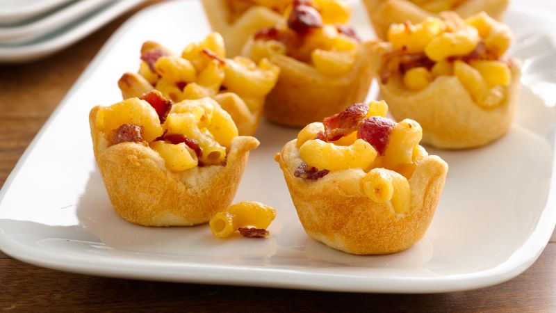 Heat oven to 350°F. Spray 2 mini muffin pans with cooking spray. In 2- to 3-quart saucepan, heat evaporated milk, hot water, macaroni and salt to boiling over high heat. Reduce heat to medium; cook 7 to 9 minutes, stirring frequently, until pasta is tender and liquid is almost gone. Remove from heat; stir in cheese until melted, then bacon. Add more salt to taste, if desired.