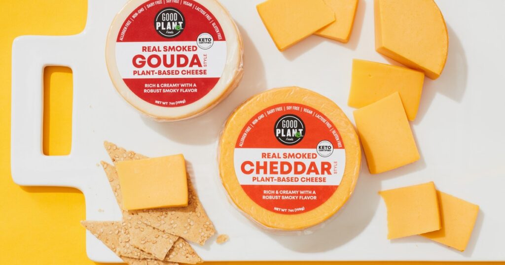 New dairy-free cheese wheels are now rolling out to 500 stores, including grocery chain Giant, before expanding to additional retailers. The new cheeses are made by GOOD PLANeT Foods, a Washington-based vegan cheese company that strives to make products that are both good for people and the planet. The coconut oil-based cheese wheels will be available in Real Smoked Cheddar and Real Smoked Gouda flavors at a suggested retail price of $5.99 per 7-ounce wheel. GOOD PLANeT created these vegan cheese wheels as allergen-friendly alternatives for use on charcuterie boards or for general snacking purposes. GOOD PLANeT Co-CEO Bart Adlam tells VegNews that these vegan cheese wheels are unique to the market as they are smoked over applewood chips for a deep, smoky flavor. “At GOOD PLANeT, we are committed to bringing innovative new offerings to dairy-free cheese,” Adlam told VegNews. “We want to offer consumers new ways to experience the joy of cheese in plant-based offerings, whether they are trying to have a better diet, or want to make a small move towards a better planet.” GOOD PLANeT Foods Dairy-free cheese innovation GOOD PLANeT’s new smoked vegan cheese wheels are not the only innovative product in the company’s portfolio. Last year, GOOD PLANeT released vegan cheese wedges that resemble those made by iconic brand Laughing Cow. These single-serve cheeses—available in Original, Pepper Jack, and Smoked Gouda flavors—were the first vegan cheeses to come in this format. With this release, GOOD PLANeT also beat Laughing Cow parent company Bel Brands to the punch as the French cheese company is currently working to create vegan versions of its iconic cheeses, with its own dairy-free Laughing Cow wedges slated for release in 2023. GOOD PLANeT Foods In addition to its wheels and wedges, GOOD PLANeT also produces vegan cheese slices and shreds in flavors such as cheddar, mozzarella, and American. The brand’s products are currently distributed at more than 1,200 retail locations nationwide. GOOD PLANeT gets into fast-food chains On the foodservice side, GOOD PLANeT also helps fast-food chains diversify their options. Fast-food chain White Castle was one of the first to offer a plant-based burger option when it added Impossible Sliders to its menu at 385 locations nationwide. While the patty of the slider is a plant-based Impossible Burger, it comes topped with dairy-based cheddar cheese. In 2020, White Castle launched a test of GOOD PLANeT’s vegan cheddar cheese at select locations in New York and New Jersey. Most recently, GOOD PLANeT partnered with Fuddruckers, the first Black-owned burger franchise in America. Fuddruckers now offers GOOD PLANeT’s vegan cheese in American, Smoked Provolone, and Pepper Jack flavors which can be added to burgers, sandwiches, and salads. Alongside the new vegan cheese options, Fuddruckers is also exploring items from vegan brand Beyond Meat (burgers, sausages, and chicken tenders); plant-based chicken cutlets by United Kingdom-import Meatless Farm; and vegan bacon by California brand Hooray Foods. For more about dairy-free cheese, read: