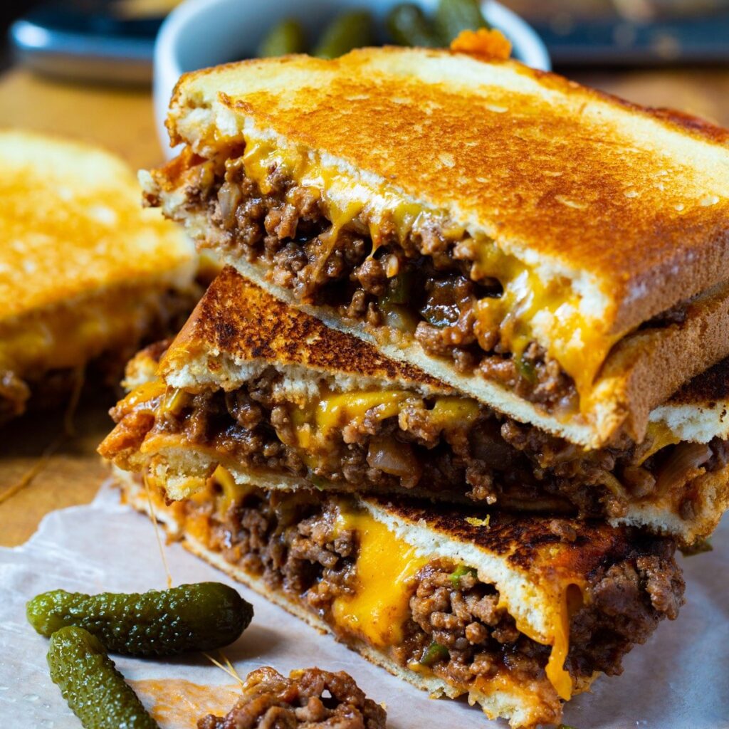 This post may contain affiliate links. Please read my disclosure policy. Grilled Cheese and Sloppy Joes married together. This is so good y’all. During the fall I tend to either like long, slow-cooked meals or super quick and easy ones for those busy days. Prep in Advance This one is so simple to prepare in hardly any time at all. You can even make the sloppy joe part a few days in advance. Maybe on a Sunday evening so you already have a meal half made for the week. Type of Bread To Use I can’t seem to find Texas Toast at my grocery store any more. What’s up with that? So instead I used a hearty white bread which I actually really like for grilled cheese becasue it holds up so well. Pepperidge Farm Hearty White is the one I buy. The sloppy joe mixture is a little sweet and it gets covered in melted ooey, gooey cheddar cheese. Use another type of cheese if you like. I like to use a lot of sloppy joe in relation to the cheese, but you can go heavier on the cheese and lighter on the sloppy joe. And that golden, buttery crust on the bread! Seriously yum y’all. Watch the short video below to see how easy this recipe is: Sloppy Joe Grilled Cheese Sloppy Joe Grilled Cheese has a slightly sweet sloppy joe filling that’s covered in melted ooey, gooey cheddar cheese ▢ 1 pound lean ground beef▢ 1/2 medium onion, chopped▢ 1/4 cup chopped green pepper▢ 2/3 cup ketchup▢ 1 1/2 teaspoons Worcestershire sauce▢ 1 teaspoon ground mustard▢ 1/2 teaspoon garlic powder▢ 1/8 teaspoon cayenne pepper▢ 8 slices Texas toast or hearty white bread▢ 1 cup shredded cheddar cheese▢ 4 tablespoons butterAdd ground beef to a nonstick pan placed over medium heat. Use a wooden spoon to break it apart as it cooks. As soon as you have it crumbled, add the onion and green pepper. Cook until beef is no longer pink and onion and pepper is softened.Add ketchup, dry mustard, garlic powder, Worcestershire sauce, and cayenne pepper. Stir to combine well and cook over medium-low heat for 5 minutes. Remove from heat.For each sandwich, spread 1/4 cup cheese on top of one slice of bread. Top with sloppy joe mixture. Place second piece of bread on top.Heat griddle or nonstick pan over medium heat. Add 1/2 tablespoon butter, let it melt and place sandwich on top. Cook until bottom is golden, lift sandwich with a spatula, place another 1/2 tablespoon of butter down, and flip sandwich over. Cook until cheese is melted.Keyword: ground beef, sloppy joeLeave a comment below and tag us @spicysouthernkitchen on social media!