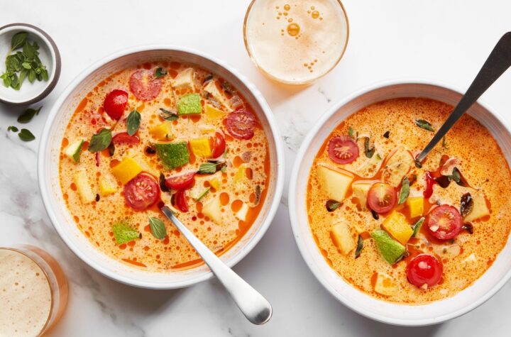 My version of a regional Mexican soup called caldo de queso, featuring potato simmered in tomato-tinted broth, with queso fresco...