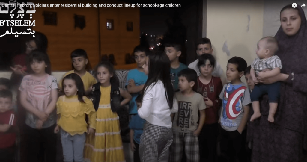 The Israeli human rights group B’Tselem published video today of a chilling incident in Hebron in which Israeli soldiers raided an extended Palestinian family at about 8 PM on September 3 and forced more than a dozen small children, some of whom were sleeping in rooms in a “residential building,” to line up for a photograph. “Because they’re throwing stones,” an Israeli soldier says. “Come on, stand still for a moment… I want to take a picture.” The soldier proceeded to line up 15 or 16 children, many of them apparently under 10, and to tell them to say Cheese, so he could get a good shot. Incidents like this one are why Rep. Betty McCollum has repeatedly introduced legislation to cut off American military aid that is used for the violation of Palestinian children’s rights, including their “ill-treatment… in Israeli military detention.” McCollum’s legislation has gotten 30 co-sponsors and has in years past died with that level of support, and lacking the backing of liberal Zionist groups such as J Street. Today J Street tweeted the B’Tselem video and its political director says it shows a “violation of international law.” The B’Tselem video has frequent references to the children’s fears. “Rawan, don’t be scared, it’s just routine,” a woman says. While the B’Tselem videographer says to the soldier, “They are kids. Do you like it when soldiers come and take a picture of your kids? They were asleep and you came and scared them.” B’Tselem says the soldiers detained men in the house in an effort to prevent the incident being documented. At the same time, some soldiers went up to the building’s rooftop and detained several young men, aged 15 to 25, preventing the family members from documenting the incident. After photographing the children, the soldiers left the building, leaving behind troubled parents and terrified children.B’Tselem says that the photograph is likely about the new facial recognition software; and that all Palestinians have their rights violated on little pretext. This footage illustrates how the routine of Palestinian subjects living under the occupation is disturbed arbitrarily and how easily soldiers violate their rights. It seems that for the military, all Palestinians, including school-age children, are potential offenders. At any time, it is permissible to wake them up at night, enter their homes and subject them to a lineup. Given this background, one should read the latest publications on the database set up by the military exclusively in the West Bank through facial recognition technology.B’Tselem issued a report early this year saying that Israel leads an “apartheid… regime of Jewish supremacy from the river to the sea.” Support MondoweissMondoweiss is a nonprofit news website dedicated to covering the full picture of the struggle for justice in Palestine. Funded almost entirely by our readers, our truth-telling journalism is an essential counterweight to the propaganda that passes for news in mainstream and legacy media.Our news and analysis is available to everyone – which is why we need your support. Please contribute so that we can continue to raise the voices of those who advocate for the rights of Palestinians to live in dignity and peace.Support Mondoweiss from as little as $1. Thank you.