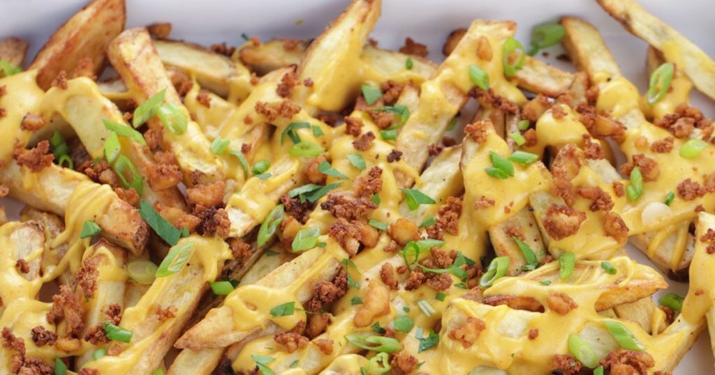 539sharesCrispy oven baked fries + melty stretchy gooey vegan nacho cheese + homemade tofu bacon bits = the best ever (surprisingly healthy) Easy Vegan Cheese Fries!! Can you call cheese fries a dinner? Well, regardless of what might be the correct answer, I’m calling them a dinner because we’ve been making these loaded vegan cheese fries for dinner on repeat. And let me tell you, during these chilly winter months, they are the epitome of comfort food! The best thing about these vegan cheese fries is that they are actually decently healthy. No really, don’t go, hear me out! The fries are homemade and baked in an oven with just 1 tablespoon of oil for the entire batch. You could even reduce or omit the oil if you prefer. The cheese is made from raw cashews, water, and some seasoning. And even the bacon bits, are made from tofu and seasoning. (Both recipes are oil-free). And of course if you like you could reduce salt to your preference. I wasn’t even really aiming for health when making these recipes, that’s just the way the recipes tasted the best, how cool is that!? Sometimes I even like to add some roasted broccoli or cauliflower along with the fries to make it more of a full meal. YUM! This comfort food heaven is simple to prepare fresh, but if you’re a prep ahead kind of person you can make the tofu bacon bits and the nacho cheese ahead of time, and store in the fridge a few days in advance. How to Make Easy Vegan Cheese Fries: These can be prepared ahead of time and stored in an air-tight container in the fridge or frozen. You only need about ¼ cup bacon bits for this recipe, (the full tofu bacon bits recipe makes about 1 ½ cups), but I recommend making the entire recipe because oh man is it delish!!!! I almost always have these on hand because they are a great addition to any dish. Soups, salads, sandwiches, pasta, the options are endless. When preparing this recipe, add an extra ½ cup of water to the recipe (total water will be 1 ½ cups) so that the cheese is thinner and more pourable. This can also be made ahead of time and stored in the fridge for 3 – 5 days. Reheat over medium heat, adding more water if needed. If you have a copy of my cookbook Fuss-Free Vegan you could alternatively use my recipe Nacho Cheese Love on page 201 which is basically the same recipe with just a few tweaks. You will only need about half of the cheese sauce for the vegan cheese fries, but I recommend making a full batch of nacho cheese because you will most likely want to make vegan cheese fries again the following day! And even if you don’t (unlikely), you can use this nacho cheese on nachos, to dollop onto soup, pour over steamed broccoli, or to make a grilled cheese sandwich. Follow my recipe to make crispy baked French fries or you can make fries in an air-fryer. If using store-bought freezer fries, follow the instructions on the package. To Make Vegan Cheese Fries: Once baked, pour all the fries onto the same baking sheet, or a serving dish. Drizzle generously with the nacho cheese. Sprinkle the tofu bacon bits on top. Garnish with any optional toppings as desired. Serve hot. Easy Vegan Cheese Fries Crispy french fries with homemade stretchy melty vegan nacho cheese, and tofu bacon bits. The perfect comfort food for movie night or game night. Surprisingly healthy and can even be made oil-free! Prep Time10 minsCook Time1 hr 25 minsCourse: Appetizer, Main Course, Side Dish, SnackServings: 2 Servings as a main Optional toppings:Make the tofu bacon bits. These can be prepared ahead of time and stored in an air-tight container in the fridge or frozen. I almost always have these on hand because they are a great addition to any dish! Make the nacho cheese. When preparing this recipe, add an extra ½ cup of water to the recipe (total water will be 1 ½ cups) so that the cheese is thinner and more pourable. This can also be made ahead of time and stored in the fridge for 3 – 5 days. Reheat over medium heat, adding more water if needed.. Follow my recipe to make crispy baked French fries or you can make fries in an air-fryer. If using store-bought freezer fries, follow the instructions on the package.To Make Vegan Cheese Fries: Once baked, pour all the fries onto the same baking sheet, or a serving dish. Drizzle generously with the nacho cheese. Sprinkle the tofu bacon bits on top. Garnish with any optional toppings as desired. Serve hot.Oil-free: to make oil free simply make the fries without oil on parchment paper or silicon matt lined baking sheet. The nacho cheese and bacon bits are already oil-free. Make ahead: Both the nacho cheese and bacon bits can be made well ahead of time, and stored in the fridge in air-tight containers for a few days. Fries should be baked fresh. Make it full meal: To make this a bit healthier and more of a full meal, I love to add roasted broccoli and/or cauliflower in with the fries. Both broccoli and cauliflower take about 15 -20 minutes to roast, so you can add them to the oven in the last 20 minutes of baking the fries. Soaking fries: soaking the homemade fries before baking them will make for the crispiest fries, but if you forget or don’t have the time, un-soaked fries will still be great, just less crispy. Serving: 1serving (recipe makes 2 servings) | Calories: 432kcal | Carbohydrates: 57g | Protein: 17g | Fat: 17g | Saturated Fat: 4g | Sodium: 2889mg | Potassium: 1227mg | Fiber: 7g | Sugar: 6g | Vitamin A: 694IU | Vitamin C: 21mg | Calcium: 65mg | Iron: 6mg Did You Make This Recipe?Tag @itdoesnttastelikechicken on Instagram and Hashtag #itdoesnttastelikechicken