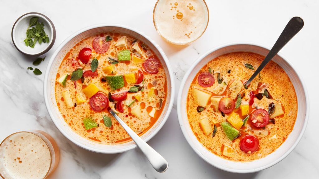 My version of a regional Mexican soup called caldo de queso, featuring potato simmered in tomato-tinted broth, with queso fresco added to each bowl.