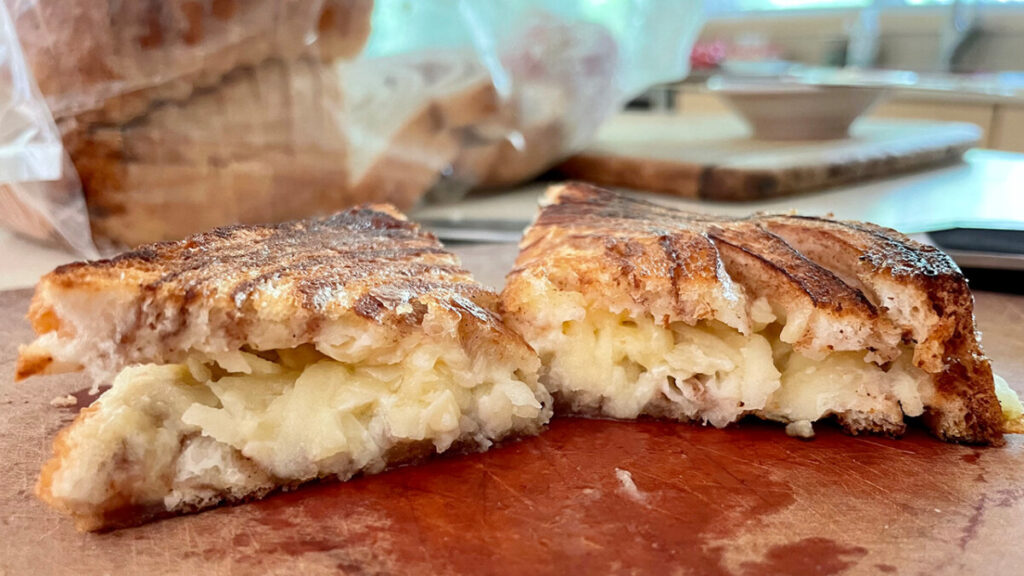 A sandwich like no other! Ingredients: For each sandwich: 1/2 cup grated sharp cheddar cheese 1/2 of an apple, peeled, grated (Honeycrisp works great!) 2 slices cinnamon bread Butter, softened Inst…