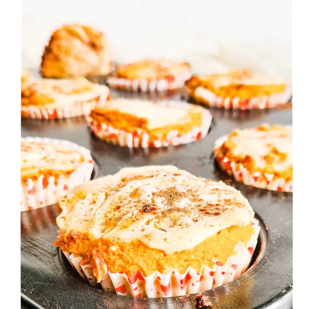 Amazingly tasty, moist, light, and fluffy low carb and keto pumpkin muffins made with almond flour, coconut flour, and cream cheese! These pumpkin spiced muffins are easy to make, gluten-free, and are amazing to have for breakfast or brunch. I have to admit, this recipe is by far one of my favorite recipes for fall or autumn. Nothing beats biting into some delicious pumpkin spiced muffins with a soft cream cheese middle. Pair that up with a wonderful cup of coffee or tea and you have the best breakfast ever! Why you should make these Keto Pumpkin Muffins These muffins speak for themselves when it comes to taste and simplicity. I have made them for friends and family, and they are always a hit. I can tell you, these beat the ones you would buy at the coffee shops. The best part? They are absolutely healthy as they have no sugar. Each muffin has only 5 grams of net carbs. These are the ingredients you will need to make the pumpkin muffins. Now, I know it may sound like a lot of ingredients, but these are all keto staples, plus, once you have stocked your pantry, you can easily use them in other low-carb recipes. Here are the ingredients you will need to make the cream cheese filling:- Step by Step Instructions As you can guess from the name, making these keto cream cheese pumpkin muffins basically involves two steps namely: Start by preparing the sugar-free cream cheese filling or frosting: In a small bowl and using an electric or hand mixer, beat together cream cheese, powdered monk fruit sweetener, and vanilla extract until creamy and smooth. Cover the with a plastic wrap or cling-film, and keep in it the fridge to chill while you make the muffin batter. You want to keep it as cold as possible, so it stays in the middle and does not spread during baking. Next, make the muffin batter as follows: Preheat the oven at 350 degrees F (about 177degrees C). Prepare the muffin tin by greasing it with some melted coconut oil or lining it with muffin liners. Using a medium-sized mixing bowl, combine the dry ingredients – almond flour, coconut flour, pumpkin pie spice, baking powder, baking soda, psyllium husk, granulated monk fruit sweetener, and salt. In another mixing bowl, prepare the wet ingredients by whisking eggs, pumpkin puree, apple cider vinegar, coconut oil, almond milk, and vanilla extract. Add the dry ingredients to the wet ingredients above and combine properly until you obtain a nice smooth batter. Also, bear in mind that the dough will be slightly firm, and not as runny. Using an ice-cream scoop or a spoon, fill each muffin liner about halfway with batter. Place some of the cream cheese mixture in the middle then top again with the rest of the batter. Scoop any leftover cheese filling on top. If you like, use a toothpick to make swirls on the surface. I like to sprinkle some pumpkin pie spice on top, just before popping them in the oven. Bake for about 20-30 minutes or until the tops turn golden brown and a toothpick inserted at the center comes out clean. Serve your low-carb pumpkin muffins with a cup of coffee or tea for breakfast, or enjoy them as a healthy afternoon snack. Tips to making the best Keto Cream Cheese Pumpkin Muffins! Here are a few tips that will help you make these amazing muffins. Variations and Substitutions There are so many ways to vary your low carb pumpkin muffins. How to store Just like these spiced persimmon muffins, the low carb and keto pumpkin muffins store absolutely well. They will keep on the countertop for up to 5 days and in the fridge for about one week. Freeze them for 2-3 months by keeping them in a single layer in an airtight container, in the freezer. Also, label any freezing bags or containers used properly with the name, baking date, and the date frozen. To use the frozen muffins, allow them to thaw completely on the countertop before using. Simply warm up the thawed muffins in the oven for about 3-5 minutes to give them a freshly baked feel and warmth. Here are some other tasty fall recipes for you to check out! Low Carb Keto Pumpkin Cream Cheese Muffins Easy, moist and delicious low carb pumpkin muffins with a cream cheese filling, made using almond flour, coconut flour, and pumpkin pie spice. These keto muffins are also gluten-free. 5 from 1 voteLow Carb and Keto Pumpkin MuffinsCream Cheese FillingMaking the Cream Cheese Filling or FrostingIn a small bowl and using an electric or hand mixer, beat together cream cheese, powdered monk fruit sweetener, and vanilla extract until creamy and smooth. Cover it with a plastic wrap or cling-film, and keep in it the fridge to chill while you make the muffin batter. You want to keep the frosting as cold as possible, so it stays in the middle and does not spread during baking. Making the Low Carb Pumpkin Muffin BatterPreheat the oven at 350 degrees F (about 177degrees C).Prepare the muffin tin by greasing it with some melted coconut oil or lining it with muffin liners.Using a medium-sized bowl, combine the dry ingredients – almond flour, coconut flour, pumpkin pie spice, baking powder, baking soda, psyllium husk, granulated monk fruit sweetener, and salt.In another bowl, prepare the wet ingredients by whisking eggs, pumpkin puree, apple cider vinegar, coconut oil, almond milk, and vanilla extract.Slowly add the dry ingredients into the bowl with the wet ingredients and combine properly until you obtain a nice smooth batter. Bear in mind that the dough will be slightly firm, and not as runny.Using an ice-cream scoop or a spoon, fill each muffin liner about halfway with batter. Place some of the frosting in the middle then top again with the rest of the batter. Scoop any leftover cheese filling on top. If you like, use a toothpick to make swirls on the surface. I like to sprinkle some pumpkin pie spice on top, just before popping them in the oven.Bake for about 20-30 minutes or until the tops turn golden brown and a toothpick inserted at the center comes out clean.Serve the keto pumpkin cream cheese