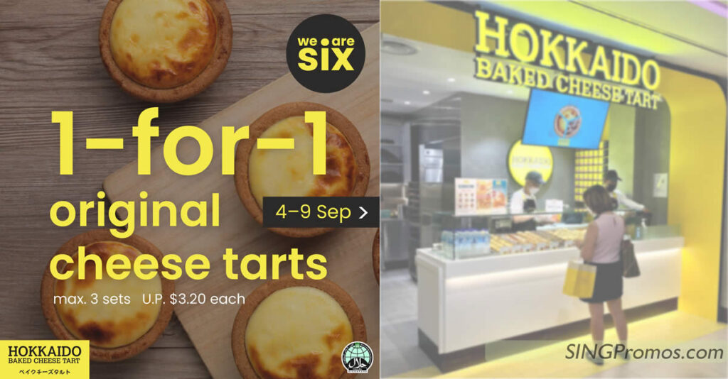 Valid at selected Hokkaido Baked Cheese Tart outlets from 12nn-2pm and 6pm-8pm Hokkaido Baked Cheese Tart P5D ON TODAY Starts4 Sep 2022 (Sun)Ends9 Sep 2022 (Fri)Location Hokkaido Baked Cheese Tart SINGPromos is now on Telegram 6 days of celebrationHokkaido Baked Cheese Tart celebrates their 6th anniversary with 1-for-1 Original Cheese Tarts promotionMax. 3 sets U.P. $3.20 each. Promotion on original cheese tarts only, no changing of flavours.The offer is valid 12nn-2pm & 6pm-8pm at these outlets 4-5 Sep Bugis Junction #B1-K6 Chanqi Airport T3 #B2-11 6-7 Sep Causeway Point #B1-K25 Jurong Point #B1-K2 8-9 Sep Junction 8 #02-30 Northpoint City #B1-46 Parkway Parade #01-23B Terms & Conditions Valid at specified Hokkaido Baked Cheese Tart outlets from 4-9 September 2022 only. Promotion on original cheese tarts only, no changing of flavours. While stocks last. Limited to 3 sets per transaction. Extra boxes chargeable. Not valid with other ongoing promotions, privileges and vouchers. Promotion is not sponsored, endorsed or administered by, or associated with Singpromos All prices listed in SGD. Picture for illustration purposes only. The management reserves the right to amend the terms and conditions without prior notice.Find your nearest outlet here (Note: valid only 12nn-2pm & 6pm-8pm at selected outlets)Share this with your friends & loved ones on Facebook! Advertisement Related NewsMcDonald’s S’pore offering S$14.90 Breakfast Family Meal (usual fr $19.30) deal till 11 Sep 2022 Deal is available while stocks lastMcDonald’s S’pore offering 2 for $3 Hershey’s Sundae on weekdays 3 – 5pm till 9 Sep 2022 Weekday saversLay’s S’pore giving FREE KFC meal with every purchase of any 2 big bags of Ruffles or Doritos till 30 Sep 2022 With every purchase of any 2 big bags of Lay’s Ruffles or Doritos (170g – 198.4g)Sheng Siong 3-Days 2 – 4 Sep Specials has Mooncakes, Haagen-Dazs, L’Oreal, Yeo’s, Cowhead and more 3 days specialsIKEA S’pore Restaurants “Kids Eat Free” promo returns from Sept 5 – 9, 2022 Choose from Kids meatball, Kids plant balls or Kids pasta Starts4 Sep 2022 (Sun)Ends9 Sep 2022 (Fri)Location Hokkaido Baked Cheese Tart SINGPromos is now on Telegram 6 days of celebrationHokkaido Baked Cheese Tart celebrates their 6th anniversary with 1-for-1 Original Cheese Tarts promotionMax. 3 sets U.P. $3.20 each. Promotion on original cheese tarts only, no changing of flavours.The offer is valid 12nn-2pm & 6pm-8pm at these outletsTerms & ConditionsFind your nearest outlet here (Note: valid only 12nn-2pm & 6pm-8pm at selected outlets)Share this with your friends & loved ones on Facebook!