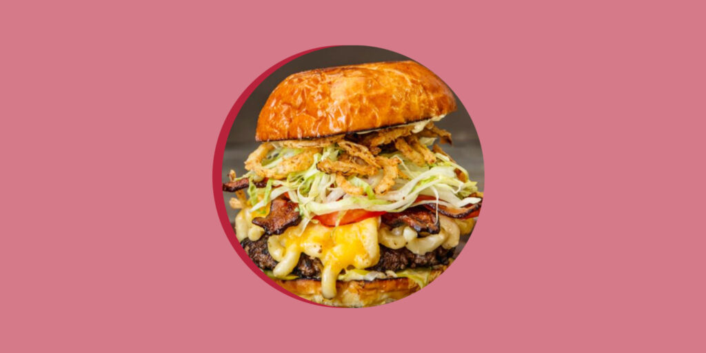 For the Donkey Sauce: Combine all ingredients in a food processor and blend until smooth. For the SMC (Super Melty Cheese): 1. In a 2-quart saucepan, bring water and half-and-half to a simmer over medium heat. 2. Maintain medium heat and add the hot sauce and Worcestershire sauce. 3. Using a whisk, mix in the Velveeta, 2 ounces at a time, until it has fully incorporated. 4. Using the same method of adding the cheese slowly, add in all other cheeses. 5. Continually mix until all cheese has melted and the sauce is smooth. For the garlic butter: Combine all ingredients in a stand mixer or food processor and mix until smooth and fully incorporated. For the crispy onions: 1. Combine the buttermilk and sliced onions. Ensure the onions are submerged in the buttermilk. Allow to soak for a minimum of 30 minutes. 2. Combine the remaining ingredients, except for the oil, in a mixing bowl and whisk to fully incorporate. 3. Preheat oil in a large Dutch oven or countertop fryer to 350 F. Fill halfway so it doesn’t overflow when frying. 4. Drain the buttermilk from the onions and allow the excess to drip off. 5. Dredge the onions in the seasoned flour to coat evenly. Shake off the excess and place in the fryer. Work in batches so you don’t overload the fryer and the onions can cook evenly. 6. Fry until golden-brown. Use tongs or a wire skimmer to move the onions around so they cook evenly. Be careful not to splash the oil. 7. Remove from the oil and allow the excess oil to drip off. Place the crispy onions on a sheet pan with a cooling rack. Season with salt and pepper. For the burgers: 1. Season the burger all the way around with kosher salt and place on a griddle for 45 seconds. 2. Using 2 large spatulas, cross the spatulas by placing one diagonal across the other and smash the burger ball to 1/3-inch thickness and cook until the juices begin to come out of the top of the burger. Lean into it! 3. Flip to a new spot on the griddle. 4. Brush the inside of the bun with garlic butter. Toast the bun with Garlic Butter until golden. 5. Flip the bun and toast the outside of the bun lightly, giving it a “kiss” on top. 6. Spread the Donkey Sauce from coast to coast on the top and bottom bun. 7. Evenly spread 5 slices of pickles first and then 3 slices of onions on the bottom bun. 8. Mix the hot, cooked macaroni with the SMC in a medium mixing bowl. 9. Top the burger with mac and cheese and a slice of cheddar. Cover the burger with a dome and squirt with 1 ounce of water. Allow the burger to steam under the dome until the cheese is completely melted, about a minute. 10. Remove the burger from the dome and place on the bun. Top with bacon, tomato, lettuce, vinegar and crispy onions. Finish with top bun and secure with a long skewer.