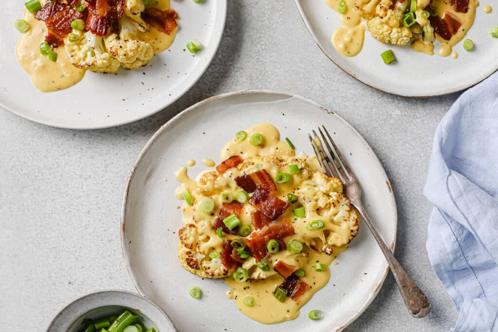 Published: Aug 18, 2021 · Last Updated: Aug 18, 2021 by Roasted Cauliflower Steaks with Cheese Sauce This post may contain affiliate links These Roasted Cauliflower Steaks with Cheese Sauce are the ultimate in low carb comfort food side dishes. Perfectly seasoned cauliflower, roasted until it is tender with crispy edges, then topped with a rich and creamy cheese sauce, bacon, and green onions. Table of Contents hide Ingredients in Roasted Cauliflower Steaks with Cheese Sauce Step by Step Instructions How to make Oven Roasted Cauliflower Steaks with Cheese Sauce STEP 1: Preheat the oven to 425°F. Line a rimmed baking sheet with parchment paper or a silicone baking mat. Cut the cauliflower into 6 equal slices or “steaks,” slicing from the top down through to the core. Place the cauliflower steaks in a single layer on the prepared baking sheet, drizzle with the olive oil, and then sprinkle generously with salt and pepper. STEP 2: Roast the cauliflower steaks for 15 minutes, then flip and roast for an additional 5 to 10 minutes, until fork-tender and browned on the edges. STEP 3: While the cauliflower is roasting, make the sauce: Place the heavy cream, cheddar cheese, garlic, Dijon mustard, hot sauce, salt, and pepper in a large saucepan over medium heat. STEP 4: Stir continuously until the cheese has melted and the ingredients are well incorporated, then reduce the heat to low and stir occasionally while the cauliflower finishes roasting. STEP 5: Top the cauliflower steaks with the cheese sauce, bacon, and green onions before serving. Recipe Tips and Variations Frequently Asked Questions Can I use frozen cauliflower in place of fresh cauliflower? Yes, you can use frozen cauliflower florets in this recipe, but they may not get as crispy when roasting. Yes, you can use frozen cauliflower florets in this recipe, but they may not get as crispy when roasting. How can I make a dairy free cheese sauce? To make this recipe dairy free, you can use almond milk or coconut milk in place of the heavy cream, and then use any of your favorite vegan cheeses in place of the cheddar and parmesan. Some of my favorite plant based cheese brands are Miyokos and Daiya. You can even buy a pre-made dairy free cheese sauce. I like this one a lot. To make this recipe dairy free, you can use almond milk or coconut milk in place of the heavy cream, and then use any of your favorite vegan cheeses in place of the cheddar and parmesan. Some of my favorite plant based cheese brands are Miyokos and Daiya. You can even buy a pre-made dairy free cheese sauce. I like this one a lot. Other Recipes You Might Enjoy NEVER MISS A RECIPE! Get our newest recipes sent directly to your inbox as soon as they are released. CLICK HERE TO SUBSCRIBE Roasted Cauliflower Steaks with Cheese Sauce These Roasted Cauliflower Steaks with Cheese Sauce are the ultimate in low carb comfort food side dishes. Perfectly seasoned cauliflower, roasted until it is tender, with crispy edges, then topped with a rich and creamy cheese sauce, bacon, and green onions. 1 large head cauliflower 2 tablespoons olive oil sea salt and ground black pepper ¾ cup heavy cream 2 cups shredded sharp cheddar cheese 2 cloves garlic, minced 1 tablespoon Dijon mustard 1 teaspoon hot sauce ½ teaspoon sea salt ¼ teaspoon ground black pepper 8 slices bacon, cooked crisp and chopped 4 green onions, sliced Preheat the oven to 425°F. Line a rimmed baking sheet with parchment paper or a silicone baking mat. Cut the cauliflower into 6 equal slices or “steaks,” slicing from the top down through to the core. Place the cauliflower steaks in a single layer on the prepared baking sheet, drizzle with the olive oil, and then sprinkle generously with salt and pepper. Roast the cauliflower steaks for 15 minutes, then flip and roast for an additional 5 to 10 minutes, until fork-tender and browned on the edges. While the cauliflower is roasting, make the sauce: Place the heavy cream, cheddar cheese, garlic, Dijon mustard, hot sauce, salt, and pepper in a large saucepan over medium heat. Stir continuously until the cheese has melted and the ingredients are well incorporated, then reduce the heat to low and stir occasionally while the cauliflower finishes roasting. Top the cauliflower steaks with the cheese sauce, bacon, and green onions before serving. net carbs per serving: 5.1g Storage: I recommend storing the leftover cauliflower steaks and keto cheese sauce separately. That way, when you reheat the cauliflower, you can crisp it back up. Spice it Up: Kick things up a notch and add some more hot sauce to the cheese sauce to make. Make it vegetarian: Skip the bacon on these roasted cauliflower steaks to make this the perfect vegetarian keto side dish. Category: Side Dish RecipesMethod: BakingCuisine: American Nutrition Keywords: keto cheese sauce, roasted cauliflower recipe, keto cauliflower recipes, low carb cauliflower steaks, low carb cheese sauce, cheesy bacon sauce, low carb sauce recipes, keto side dishes, low carb side dishes, vegetarian side dish recipes Did you make this recipe? Tag @kyndraholley on Instagram and hashtag it #peaceloveandlowcarb Low Carb, Keto, Gluten Free Weekly Meal Plans Are you ready to take the guesswork out of that stressful weeknight meal planning? Peace, Love and Low Carb – Low Carb and Gluten Free Weekly Meal Plans are low carb, gluten free, and keto friendly. All recipes include a color photo and complete nutritional analysis. Comes with a printable grocery list, snack list, tips for meal prepping and suggestions for substitutions. It is definitely the most comprehensive low carb meal plan out there. And for only $4.99 per week, you simply cannot beat the price. Click HERE to order!