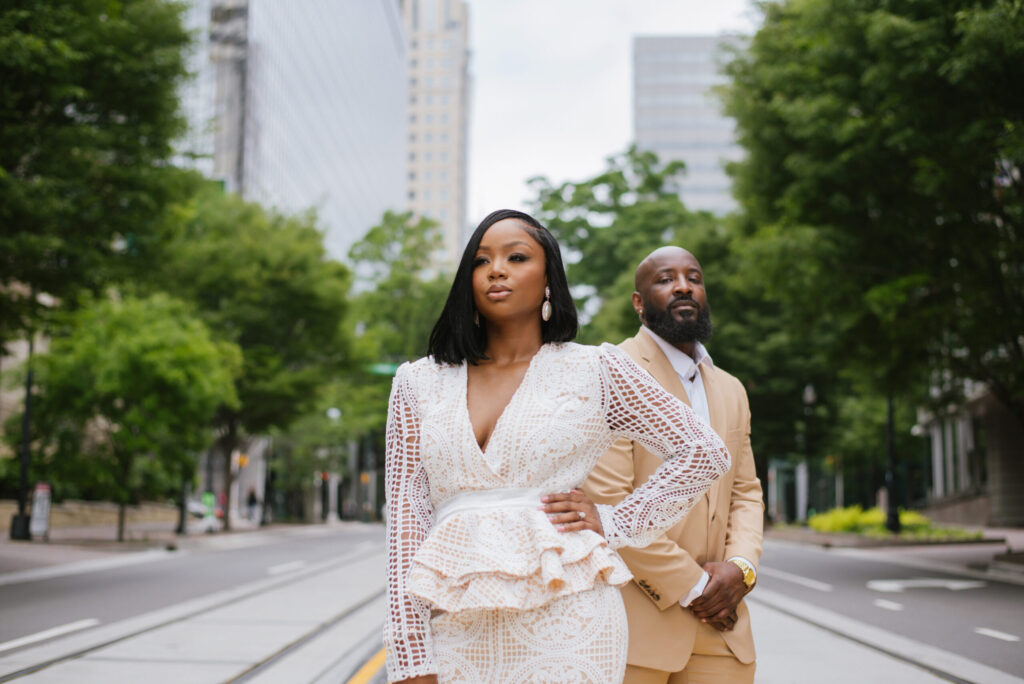 Arthur was visiting Charlotte when he noticed a group of ladies posing for a selfie. When he asked if they needed someone to take their picture, he had a goal in mind. He succeeded. Bride: Ebony Jones, 37, financial manager – Charlotte Mecklenburg Police Dept., native of Whiteville, North CarolinaGroom: Arthur Tate, 32, compliance investigator, native of Wilmington, DelawareCurrent Residence: Charlotte, North CarolinaWedding Date: May 6, 2023Venue: The Hotel Concord – Concord, North Carolina How They Met (Ebony) We met in July 2018 at an all-white party at the Ritz Carlton in Charlotte. Tate, that’s what I call him, was visiting a friend here and they were at the party. I was there with a couple of friends when he offered to take our picture. He and I started talking and he got my phone number. (Arthur) I was living in Delaware and was visiting a friend who had moved to Charlotte. We were going out for his birthday and ended up meeting at the all-white party at the Ritz. That’s when I ran in to Ebony. She was with a group of girls who were trying to pose and take a selfie. Her smile and laugh caught my attention. I introduced myself and asked them if they wanted me to take their picture. My goal was to attempt to make her laugh again while taking the picture. It was a success. We exchanged text messages for a couple of weeks. I told her that I planned to move to Charlotte, but I don’t think she believed me. We tried to stay in touch but eventually, we lost contact until I moved to Charlotte a year later. I reached out to her and asked, “Hey, do you know of any parking decks in downtown Charlotte, because I work downtown now?” I was trying to get her to take the hint, but she just replied, “No, I don’t know of one because I parked for $5 a month in my parking deck.” Later, she contacted me again and said, “You weren’t going to tell me you were in Charlotte again?” We met up and went out on a lunch date. Their First Date (Ebony) We have conflicting views about our first date. It was a Friday, and we always had casual Friday at my job. I was wearing jeans and a shirt, and we walked to Carolina Ale House. By then I vaguely remembered how he looked and thought he was shorter than he was. When I saw him, I just remember thinking, “Oh, he’s very handsome.” We talked about everything that was going on with his move and his plans, then spent time just catching up on the past year. I thought that the date went well. He says that it didn’t. I ended up having to follow up with him and ask, “Are you interested in going somewhere else?” (Arthur) That’s her side of the story. Actually, When I walked in and saw her, I was like, “Okay, all right. I’m liking what I’m dealing with right now.” I thought the date went well; I just didn’t think that she was interested. I thought it was just a regular conversation that you have among friends. That’s how it seemed to me until she reached out to me the following Monday or Tuesday. She said something like, “So, we can’t keep in touch with each other anymore?” Basically, “Hey, I haven’t heard from you since our first date.” We talked again and planned a second date to go to Firebirds for happy hours. This is “The One” Photo Credit: Brandon Grate Photography (Arthur) A lot of people say that the quarantine in 2020 was kind of rough for them. To me, it was an eye opener and a blessing, because we were able to sit down and discuss everything under the sun. We were able to open up to each other and talk about a lot of different things. There was nowhere to go and not too much to do. It left us no choice but to sit and talk. I realized that she was the one just from her thought process and the goals she had set for her life. She made me feel comfortable. Everything just clicked. Even though I was moving far away from home, I had found someone down here who had the same ideas, morals and values that I already had. It just made me feel more comfortable in Charlotte. (Ebony) There was several things that made me believe Tate was the one. The first was how he related to my son. When we met, my son was four. We waited until about June 2020 for Tate to meet my son, and he was very good with him. Tate took the time to get to know him. It was very genuine. I loved the way he did that. I also think we got closer due to COVID since we had to stay in more. Both of us ended up having COVID at different times. I got it shortly after it first came out. He was there for me. He took care of me, getting me food, medicine, all that stuff. He ended up getting it in July 2020 and I did the same thing. I wanted to make sure that he was taken care of. During that time, we got to really spend a lot of time in the house together. We had dates in the house and used Door Dash a lot. We watched a lot of movies together, just spending that extra time. By spending so much time together, we learned each other’s habits and if we could possibly live with each other. We learned a lot from that. I realized there was not much that I didn’t like about him. Even after spending all this time together, he didn’t get on my nerves. This could be something serious. The Proposal (Arthur) We had already discussed that we wanted to be together and were going to end up getting married. Those talks included possibly adding an addition to the family and getting a house. After several trips to the mall, one day we stopped by Jared, and she started trying on engagement rings. I took note of her size and the styles she liked and went back in May 2021 and purchased a ring. That began the process of trying to get everything set up. I reached out to her father and asked for permission then let my family know what was going on. It was very hard trying to surprise her because she wants to know what’s going on, and she knows my habits. So, when I was doing things that were not usual for me, like taking phone calls outside because I’ was trying to s