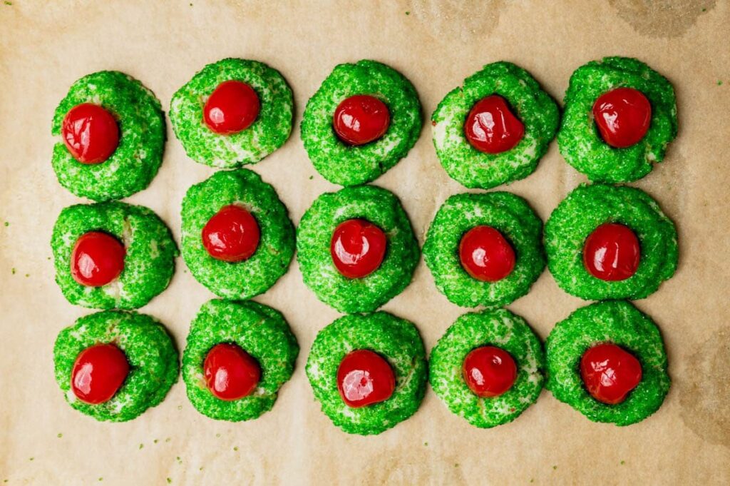 Moist, tender and delicious Cherry Cream Cheese Cookies are the perfect cookie to decorate for any holiday or occasion. I’ve only just the past couple of months started baking with maraschino cherries. You see, Matt is a huge chocolate-covered-cherry and cherry-cookie kind of guy. I’m not quite sure why, but I’ve never made him anything “cherry” before, except for classic cherry pie. He was quite pleased this past month when he came home to homemade chocolate covered cherries and two kinds of cherry cookies. I pretty much made his day with that treat. About this Cherry Cream Cheese Cookies Recipe: Egg Free cookies You’ll notice there is no egg in this recipe making them a great option for those who have an egg allergy. How to Make Cream Cheese Cherry Cookies These are easy cookies to make. You will have to plan ahead to refrigerate the cookie dough for at least an hour, but otherwise the dough comes together easily. Can you put sprinkles in cookie dough? We roll the cookie dough balls in sugar so the sugar is only the outside, but if you’d like to add a few sprinkles to the cookie dough you can do that also. Just don’t go overboard since it is adding more sugar to the dough. You could get creative and colorful with what colored sugar you used. Use pretty colors for a birthday theme, red and blue for a patriotic party, or even green sugar like we do here for Christmas. The white chocolate drizzled on top is optional. Personally, I think that white chocolate drizzle makes everything better, and it helps hold the cherry on the top of the cookie. Do cookies with cream cheese need to be refrigerated? The cream cheese is baked inside the cookies so they are ok to store at room temperature. Baked goods that have a cream cheese or cheesecake filling or frosting would need to be refrigerated. How long do cream cheese cookies last? These cookies will remain soft for 4-5 days at room temperature. They also freeze well so if you will have them longer than that, please package them well and freeze. Cherry Cream Cheese Cookies 4.67 from 3 votesMoist, tender and delicious Cherry Cream Cheese Cookies are perfect to decorate for any holiday or occasion. Servings 30 cookies1/2 cup salted butter room temperature, 4 ounces3 ounces cream cheese room temperature1/2 cup granulated sugar 100 grams1/4 teaspoon almond extract1 cup all-purpose flour 140 grams1 teaspoon baking powder1/8 teaspoon salt1/2 cup colored sugar30 red maraschino cherries drained and driedOptional topping:Using a stand mixer, cream the butter, cream cheese and sugar together in a large bowl. Scrape the sides of the bowl. Beat in almond extract. In a separate small bowl, combine the flour, baking powder and salt. Slowly add the flour mixture to the creamed mixture and mix until well combined. Cover and refrigerate the dough for 1 hour.Preheat the oven to 350ºF.Shape the dough into 30, 1-in. balls, then roll in colored sugar. Line a baking sheet with parchment paper or a nonstick baking mat. Place the cookies 2″ apart on the baking sheet. Bake for 12-13 minutes. Do not over bake. Remove from the oven and immediately press a maraschino cherry into the center of each cookie. Move the cookies to wire racks to cool.You can leave the cookies as they are, or you can drizzle them in white chocolate which will help keep the cherry in place.In a microwave-safe bowl, slowly melt the white chocolate chips in 10-15 second increments, stirring between each melting time. Use a spoon or fork to drizzle the chocolate overtop the cookies. Allow the chocolate to set completely before storing the cookies in an airtight container. Store at room temperature. Calories: 103kcal | Carbohydrates: 14g | Protein: 1g | Fat: 5g | Saturated Fat: 3g | Polyunsaturated Fat: 0.2g | Monounsaturated Fat: 1g | Trans Fat: 0.1g | Cholesterol: 12mg | Sodium: 46mg | Potassium: 32mg | Fiber: 0.3g | Sugar: 10g | Vitamin A: 136IU | Vitamin C: 0.02mg | Calcium: 19mg | Iron: 0.2mg Have you tried this recipe? Share a review below or share on Instagram with the tag #tastesoflizzyt. I’ve never met a sugar cookie I didn’t like. Fluffy and light, thick and rich…all are necessary and good and make great little desserts. Here are a few new recipes for you to try.