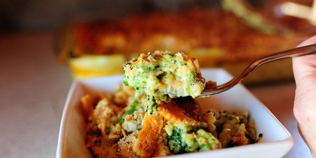 Start with broccoli. Cut it into florets, along with some chunks of the stems. Plunge the broccoli into boiling water...