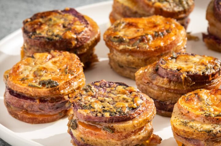 These cheesy stacks call for a combination of orange and purple sweet potatoes, as well as regular russet potatoes, for...