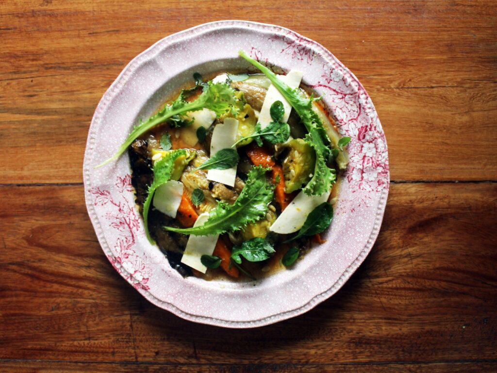 This shoulder season salad has one indispensable ingredient: fire. Regardless of time of year, the recipe takes full advantage of whatever gourds are available. Hot wood fire draws depth and texture from watery summer squash and cucumbers, which are cooked until just al-dente, while a longer roast turns starchier red kuri pumpkins creamy and tender. Feel free to improvise and adapt the technique to the produce at your own local market or grocery store. Argentine sardo cheese is a semi-firm, salty cow’s milk cheese, which is not to be confused with Italian pecorino Fiore Sardo. If unavailable in your local Latin market, substitute young provolone. Charred Squash with Sardo Cheese, Mint, and Fresh Greens Colorful summer squash and sweet pumpkins combine in this flame-kissed South American salad from Jorgelina Mandarina. Yield: serves 4 Time: 1 hour, 30 minutes For the squash: 1 whole red kuri (Hokkaido) pumpkin, or substitute kabocha (1 lb.) 2 large cucumbers (1 lb.) 2 medium zucchinis (¾ lb.) 3 medium round or pattypan squash (¾ lb.) For the dressing: ¼ cup extra-virgin olive oil 2 tbsp. rice vinegar ½ tsp. coarse pink Himalayan salt Freshly ground black pepper 1 tbsp. fresh lemon zest, divided For serving: 1 head (1 lb.) escarole, picked and washed 4 cups (2½ oz.) loosely packed baby arugula ½ cup (¾ oz) fresh mint leaves 2½ oz. Argentine sardo cheese Instructions Roast the squash: Build a wood fire in a grill or fireplace then place the pumpkin, cucumbers, zucchini, and squash directly in the coals. Cook, turning often until the skins are evenly blackened and blistered and the flesh yields to the touch. The summer squash and cucumbers will be done first (20-25 minutes), while the firm, larger pumpkin will need 10–15 minutes more. Meanwhile, make the dressing. In a small bowl, whisk together the olive oil, rice vinegar, salt, black pepper and 1½ teaspoons of the lemon zest. Transfer the vegetables to a large bowl,cover tightly with foil, and set aside at room temperature to steam. Once cool enough to handle, drain and discard any accumulated liquid, then use a paring knife to remove and discard any charred skin. Quarter the cucumber, zucchini, and round squash lengthwise. Halve the pumpkin, then remove and discard its seeds and slice into long, thick wedges. Discard any additional liquid that might have collected. Arrange the vegetables on a large platter, drizzle the dressing over the top, and set aside to marinate at room temperature for 20 minutes. To serve, top with escarole, arugula, and mint leaves; use a vegetable peeler to garnish with thin, wide slices of sardo cheese, sprinkle over the remaining lemon zest, and serve warm or at room temperature. Colorful summer squash and sweet pumpkins combine in this flame-kissed South American salad from Jorgelina Mandarina. Yield: serves 4 Time: 1 hour, 30 minutes For the squash: For the dressing: For serving: Instructions
