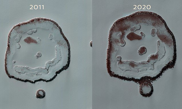 Mars has something to smile about! The infamous 'Happy Face' crater near the Red Planet's south pole has gotten noticeably bigger...