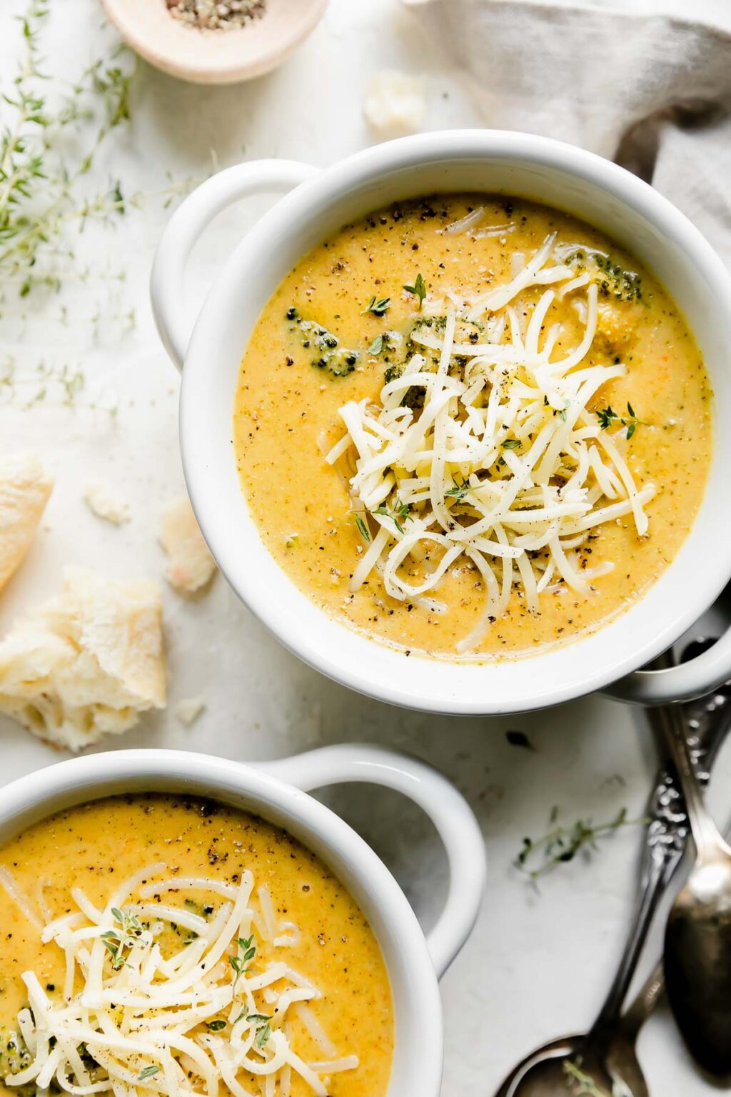 *Cozy October is Here! Here at PWWB, we always crave warm & hearty dishes as the seasons change. This month we’re featuring our favorite comfort food meals to cozy up with on a chilly evening. From long braises to simple, nostalgic flavors – & plenty of pasta! – Cozy October explores the many ways food brings joy & comfort this fall. ♡ Navigate This PostKey Ingredients Adding Beer to Broccoli Cheese Soup is the Ultimate Wisconsin-Style Twist! 🍻🧀 My absolute favorite cold weather meal is a cozy bowl of soup. While some people are very “soup isn’t a full meal” (ahem, Chris, ahem), I’m fiercely the opposite. & this particular recipe is pretty much TWO soups in one – it’s hard to get more satisfying than that! 😉 Broccoli cheddar soup & beer cheese soup are 2 of the most iconic classic soups here in the Midwest. We’ve brought them together in this recipe, using a dark, malty beer to give classic broccoli cheese soup some extra richness & an earthy complexity. It’s like the ultimate broccoli cheese soup recipe with the BEST Wisconsin-style secret ingredient. 🤫 As a born & raised Wisconsinite, beer is one of my favorite secret ingredients for added flavor – PWWB faves like Beer Brats, Bacon Cheddar Cheese Ball, & Beer-Braised Carnitas use it too! You’d honestly never guess there was beer in this broccoli cheese soup if you didn’t know, but it adds a lot. Broccoli Beer Cheese Soup Recipe Highlights We originally shared this recipe back in 2018. We love it so much that we’ve updated it with a few more flavor-boosting ingredients & improved directions. This version makes use of a russet potato for creaminess, a bit of Worcestershire for depth, & freshly grated nutmeg for a special finishing touch. The result is a broccoli beer cheese soup that’s straight-up obsession-worthy. It’s… ONE-POT PREP. Soups are the ultimate one-pot wonder! Build & simmer broccoli beer cheese soup all in one pot for easy clean-up & minimal dishes to wash at the end of the night. A COMFORT FOOD MASHUP. This recipe has all the best components of 2 iconic Midwest soups – Wisconsin beer cheese soup + classic broccoli cheddar soup. It’s creamy, cheesy, & super cozy! LOW-KEY FLAVOR LOADED. Rich & malty beer adds a subtle earthiness to classic broccoli cheese soup – you can’t necessarily tell it’s there, but you’ll definitely notice the difference it makes! Cheers to next-level broccoli cheddar soup! 🍻 ♡ Read on to learn more about how to make Beer Cheese Broccoli Cheddar Soup, or jump straight to the recipe & get cooking! Key Ingredients Note: Full ingredients list & measurements provided in the Recipe Card, below. Beer – I recommend choosing a dark, malty beer for beer cheese broccoli soup. Think a brown ale, dark lager, or porter – these will have a more earthy & complex flavor than, say, an amber, IPA, or pale ale. See the Recipe Notes, below, for more guidance!Veggies – Broccoli is a must, of course. But we’ll also use some yellow onion, carrots, & a russet potato for extra veggies!Spices & aromatics – Some garlic, mustard powder, & paprika add aromatic flavor & a tiny bit of heat. Nutmeg adds warmth & special “oooh what is that?!” kind of finishing touch.Cheddar cheese – I highly recommend buying a block of high-quality cheddar & grating it yourself for this recipe. This creates much better melty results than using pre-shredded cheese, as store-bought shredded cheeses are often packaged with an anti-caking agent that hinders melt-ability.Worcestershire sauce – My favorite pantry-staple umami flavor bomb! The littlest bit adds a ton of rich depth, which is so helpful for a quick-cooking soup recipe. Vegetable broth – I opt for a vegetable broth, which keeps this broccoli & cheese soup recipe entirely vegetarian. If you only have chicken broth or chicken stock on hand, feel free to use it instead!Heavy cream – To finish the soup with extra creaminess. You can easily use a little sour cream or cream cheese instead if you prefer. Shop This Post 7-inch Chef’s Knife Buy Now → reBoard Cutting Board Buy Now → Box Grater Buy Now → Staub 5.5-Qt Cocotte Buy Now → Immersion Blender Buy Now → Enfinigy Power Blender Buy Now → Meal Prep Tip! This broccoli cheese soup recipe moves fast once you get the stove turned on! I highly recommend taking care of all chopping & measuring beforehand. With out of the way, you can focus on building the soup once you begin cooking, without worrying about multitasking. Dice the broccoli, onion, carrot, & potatoes & grate your cheddar cheese ahead of time, then you’re good to go. How to Make Broccoli Cheese Soup with Beer This one-pot dinner comes together quickly & simmers on the stovetop in under 1 hour. It’s one of my favorite easy soup recipes to make on a chilly winter day! Full Recipe Directions, including step-by-step photos, are included in the Recipe Card, below. Soften the broccoli. This recipe uses both the broccoli florets & stems so no part goes to waste – it’s all delicious! 🥦 Soften onion in melted butter, then add the broccoli. Once it’s vibrant green, stir in a little garlic. Tip! ⇢ Transfer the veggie mixture to a plate set aside. No need to dirty another soup pot, just keep building the soup in this one! Build a roux. Melt butter in the pot & turn up the heat. Sprinkle some flour over top & whisk constantly until the mixture turns golden-brown. Why? ⇢ This mixture is a roux! It’s a simple way to thicken the soup for classic creamy texture. Add the beer. Slowly pour the beer into the pot with the roux, whisking to remove any lumps. Simmer, allowing the liquid to reduce slightly. Why? ⇢ This step captures the rich flavors of the beer while burning off its alcohol. It’s exactly like how you’d deglaze a pan with wine to infuse more flavor! Build & simmer the soup. Build the soup with vegetable stock, grated carrots, potato, Worcestershire sauce, mustard powder, s