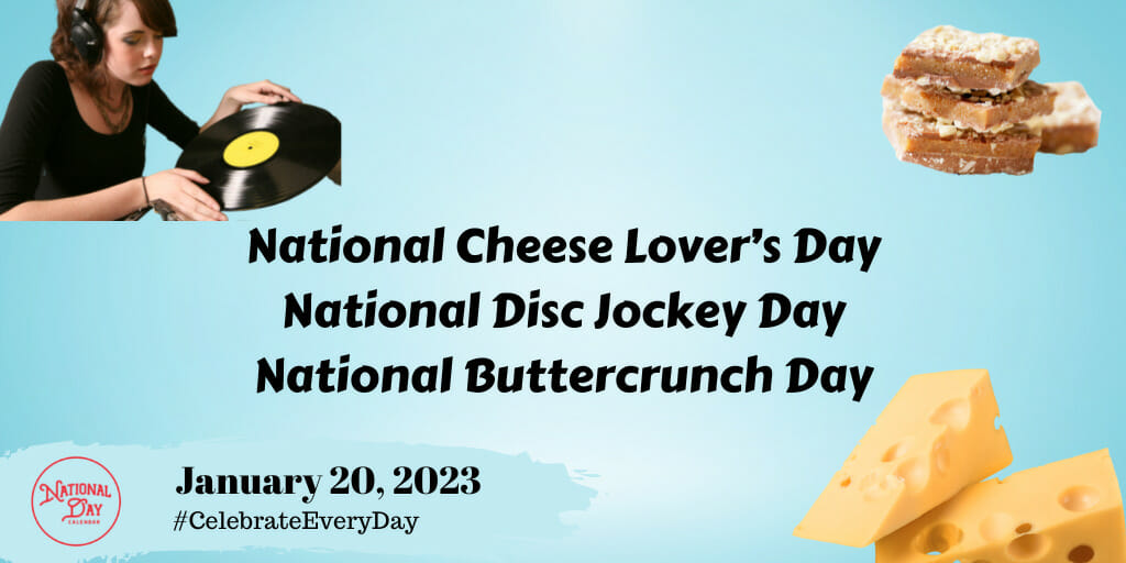 JANUARY 20, 2023 | NATIONAL CHEESE LOVER’S DAY | NATIONAL BUTTERCRUNCH DAY | NATIONAL DISC JOCKEY DAY NATIONAL CHEESE LOVER’S DAY On National Cheese Lover’s Day, don’t feel bleu, throw a feta or act capriciously. January 20th is a gouda day to kummin over and have some cheddar or asiago or fontina! Read more… National Buttercrunch Day on January 20th recognizes the flavorful toffee candy that comes in several varieties. Read more… NATIONAL DISC JOCKEY DAY Each year National Disc Jockey Day recognizes the DJs playing the music and spinning the records. The observance takes place annually on January 20th. Read more… On Deck for January 21, 2023 Recipe of the Day Spinach Cheddar MuffinPrep: 10 minutesCook: 20 minutesTotal Prep: 30 minutesServings: 12 Ingredients: 2 1/2 cups all-purpose flour2 teaspoons baking powder1/2 teaspoon baking soda1/2 teaspoon salt1 1/4 cups whole or 2% milk1/2 cup vegetable oil1 large egg1/2 cup frozen chopped spinach, thawed, drained, and pressed dry1 cup shredded cheese Instructions: Heat oven to 375°F with rack placed in the center of the oven. Line muffin tin with 12 paper liners or coat with cooking spray, butter, or oil. In a large bowl, combine flour, baking powder, baking soda, and salt. In a separate bowl, mix milk, oil, and egg. Gradually add liquid mixture to the dry mixture, stirring until just incorporated. Fold in the spinach and cheese. Fill muffin cups about 1/3 full with the batter. Bake 20 minutes until a toothpick inserted into the center comes clean. January 20th Celebrated History Sisters Victoria Woodhull and Tennessee Clafin open the first woman-owned brokerage firm in the United States. The United States Senate amends and extends the 1875 reciprocity treaty with Hawaii securing a lease to Pearl Harbor as a Naval Base. Irwin W. Cox registers the trademark for the steel-wool product called “SOS.” The initialism for the shaved steel wool saturated with soap stood for “Save Our Saucepans.” The Wisconsin Cheese Foundation sponsors the making of the world’s largest block of cheese ever made. At midnight, the process began at Steve’s Cheese in a factory near Denmark, Wisconsin. Researchers at the University of Massachusetts and Advanced Cell Technology announced the successful cloning of calves that may have produced medicinal milk. The inauguration of the 44th President of the United States takes place. President Barack Obama becomes the first African American to serve as a U.S. president. January 20th Celebrated Birthdays Harold Lincoln Gray – 1894 The American cartoonist created the well-known comic strip Little Orphan Annie. It first appeared in the Chicago Tribune on August 5, 1924. Eva Jessye – 1895 During the Harlem Renaissance, Jessye earned international recognition as the first African American woman to direct a professional choral group. George Burns – 1896 The legendary actor and comedian earned critical and commercial success during a career that spanned more than six decades. Joy Adamson – 1910 The conservationist lived and worked in the Kenyan wilderness. After raising a lion cub to be released back into the wild, Adamson wrote Born Free. The book was made into an Academy Award-winning film in 1966. Federico Fellini – 1920 One of cinema’s most celebrated filmmakers, Fellini brought the world La Dolce Vita (The Sweet Life), 81/2, and Ginger e Fred (Ginger and Fred.) Fellini’s final work was La Voce Della Luna (The Voice of the Moon) which starred Roberto Benigni. Edwin Buzz Aldrin – 1930 On July 16, 1969, the decorated Army pilot joined Neil Armstrong and Michael Collins aboard Apollo 11 for a historic launch from Cape Kennedy. Four days later, Aldrin would be one of only two people to set foot on the moon, the first being his Commander, Neil Armstrong. About National Day Calendar National Day Calendar is the original and authoritative source for fun, unusual and unique National Days! Since our humble beginnings on National Popcorn Day in 2013, we have been tracking the National Days, National Weeks, National Months, and International Days. We became the first calendar of its kind to curate the days all in one place and tell their stories, too! Here at National Day Calendar, we are on a mission to Celebrate Every Day with you! And by you, we mean families, businesses, educators, and strangers we meet on the street. There’s more than one day for everyone. At National Day Calendar, we discovered the National Days have a way of inspiring us. We’re honored to tell the stories behind the days and provide you with informational ways to incorporate the National Days into your business, family, schools, and home!
