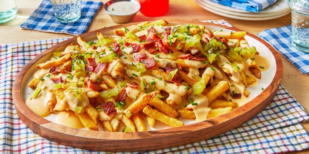 Here’s the trick to homemade cheese fries: Top frozen french fries with a homemade cheese sauce, bacon, and chopped dill pickles, served with a side of ranch.