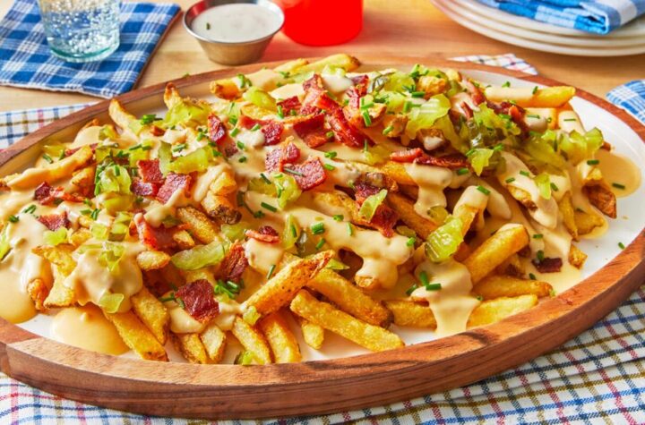 Here's the trick to homemade cheese fries: Top frozen french fries with a homemade cheese sauce, bacon, and chopped dill...