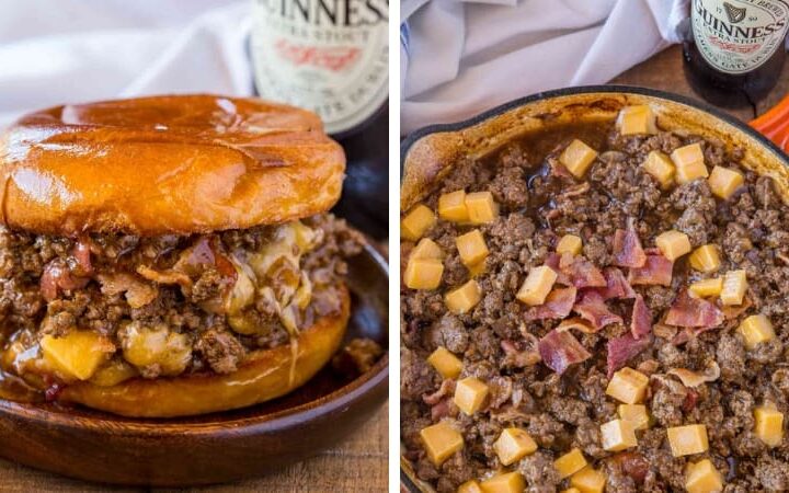 Bacon, Beer and Cheese Sloppy Joes are the perfect gameday food for a crowd with a Guinness sauce and sharp...